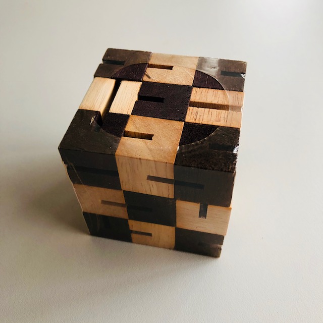 Nu is het nog een kubus, maar als je het uitrolt wordt het een slang. Probeer nu maar eens om er weer een kubus van te maken. De slangen kubus is een aan elkaar gerijgd stuk van kleine kubusjes. De bedoeling van deze puzzel is om het zodanig in elkaar te zetten dat het weer een kubus wordt. Een echte breinkraker dus.