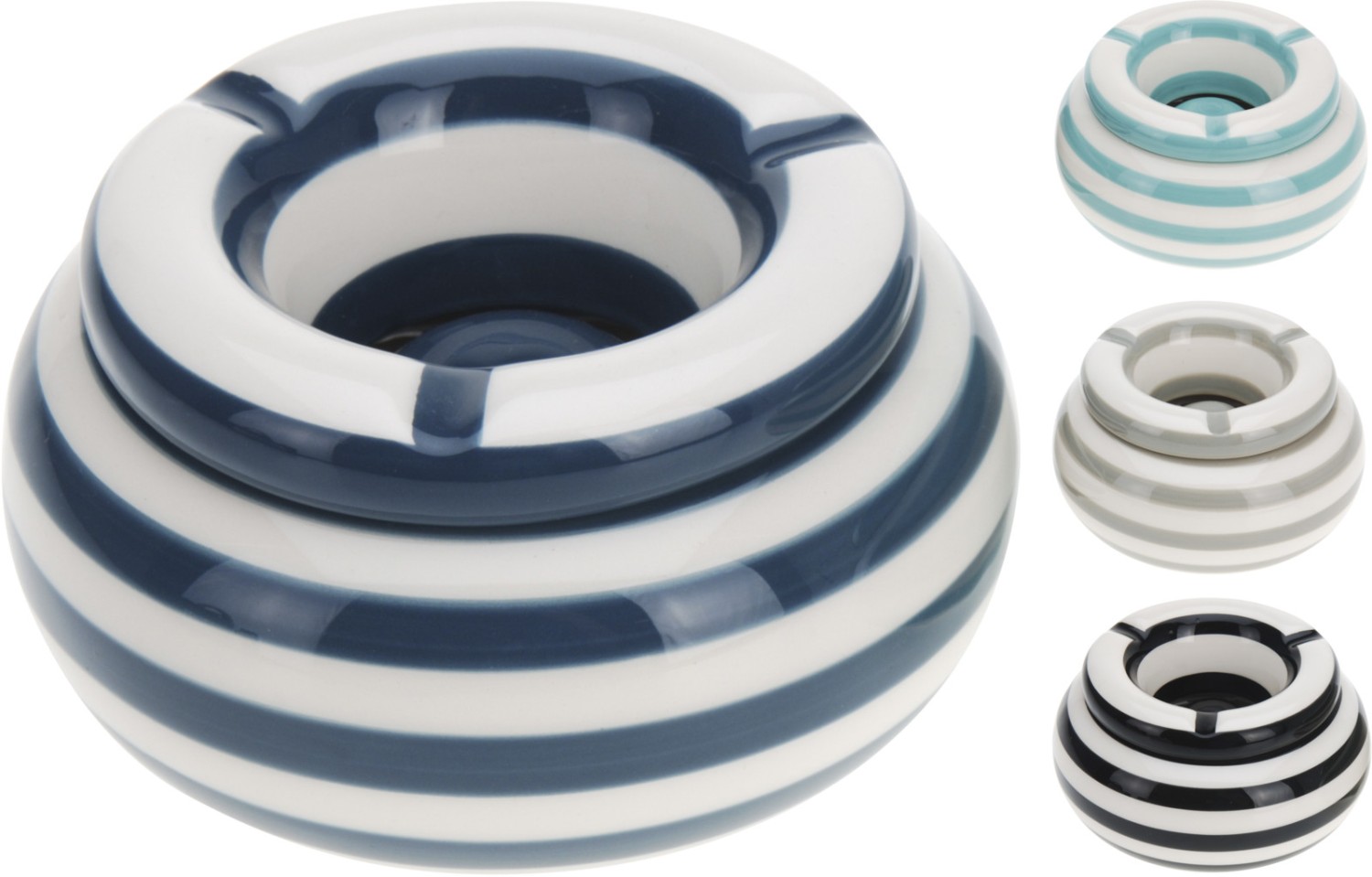 Het moderne streepmotief geeft een eigentijdse uitstraling, waardoor de asbak niet misstaat op tafel, balkon of terras.