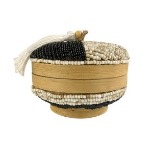 Dit prachtige handgemaakte sieradendoosje van kralen is een echte eyecatcher in ieder interieur. Het doosje is volledig gemaakt van zorgvuldig geregen, kleine kralen die samen een natuurlijke en verfijnde uitstraling creëren. Dankzij het compacte formaat, ongeveer 10 cm breed en 8 cm hoog, past het perfect op een nachtkastje, dressoir, kaptafel of in een open kast.