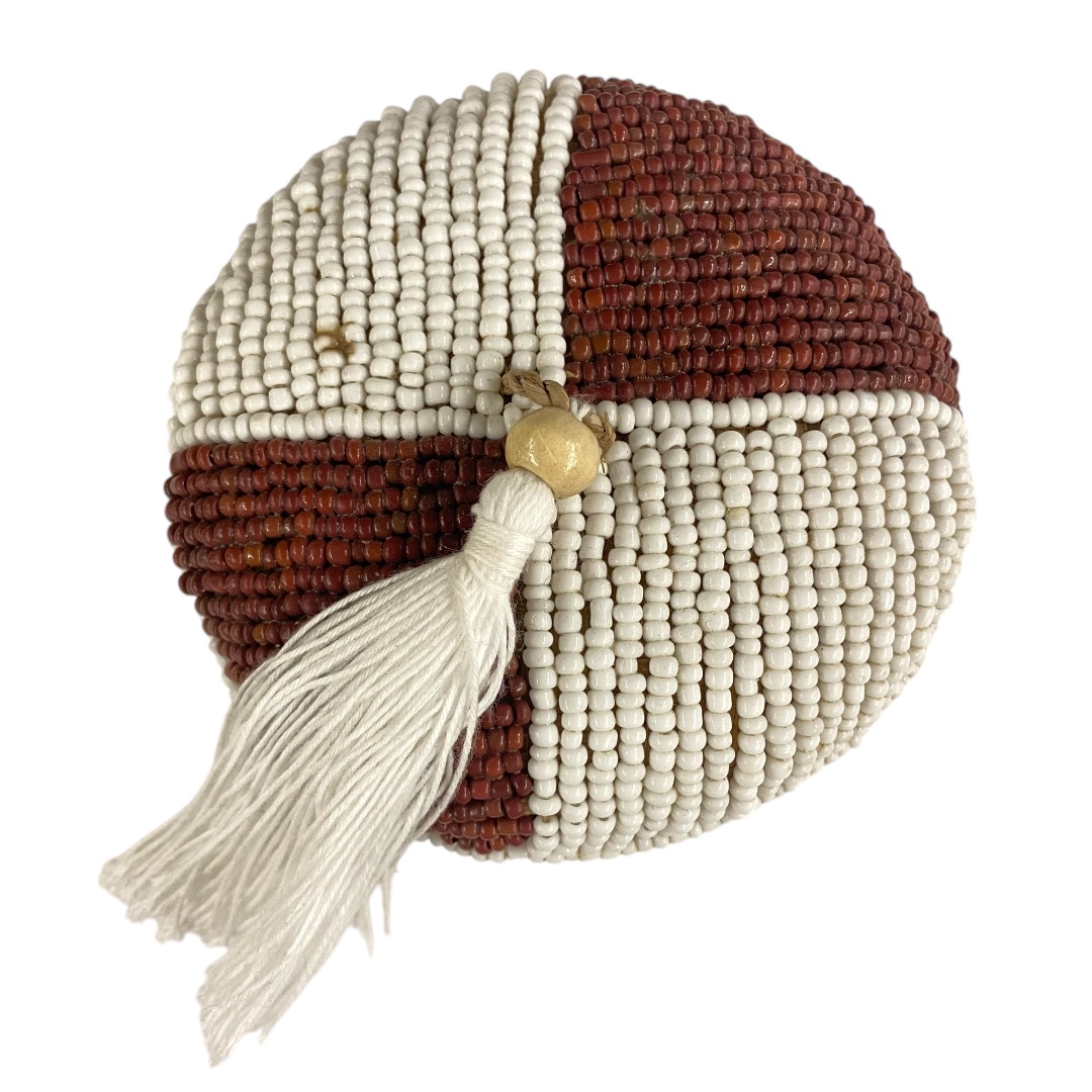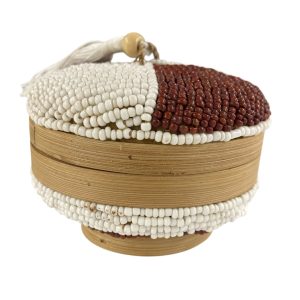 Dit prachtige handgemaakte sieradendoosje van kralen is een echte eyecatcher in ieder interieur. Het doosje is volledig gemaakt van zorgvuldig geregen, kleine kralen die samen een natuurlijke en verfijnde uitstraling creëren. Dankzij het compacte formaat, ongeveer 10 cm breed en 8 cm hoog, past het perfect op een nachtkastje, dressoir, kaptafel of in een open kast.