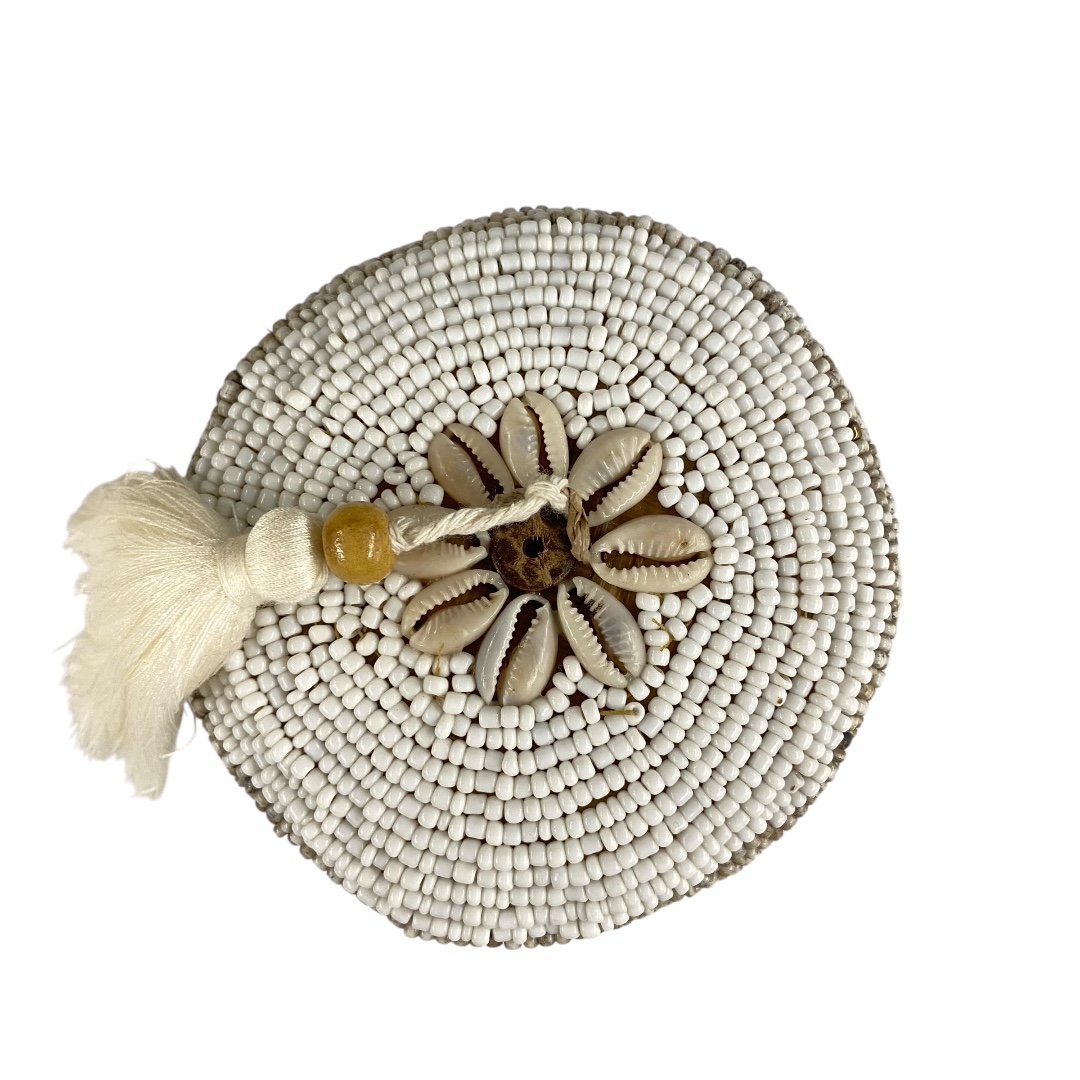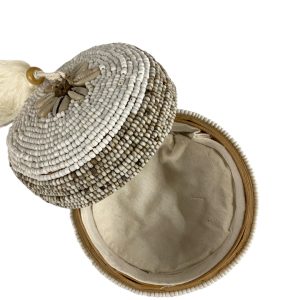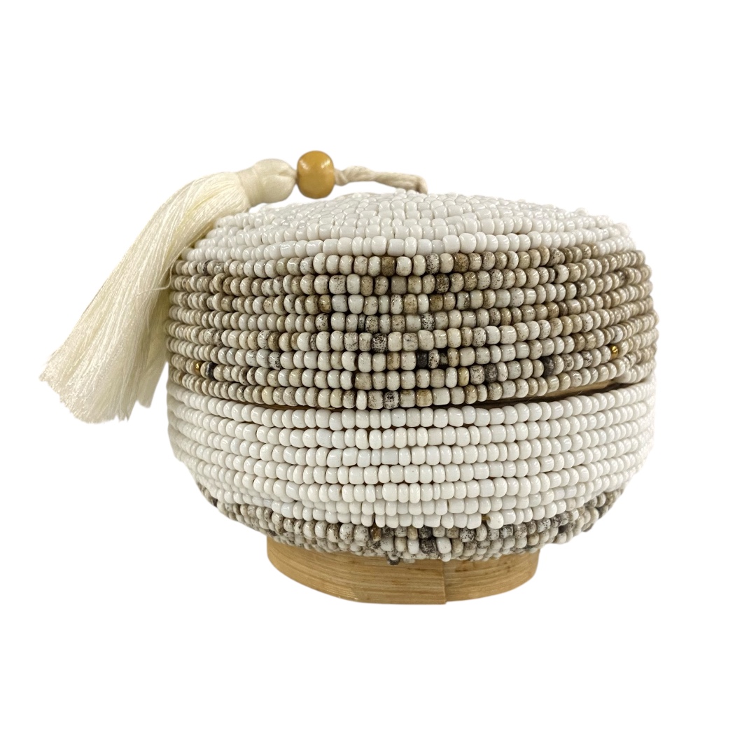 Dit prachtige handgemaakte sieradendoosje van kralen is een echte eyecatcher in ieder interieur. Het doosje is volledig gemaakt van zorgvuldig geregen, kleine kralen die samen een natuurlijke en verfijnde uitstraling creëren. Dankzij het compacte formaat, ongeveer 11 cm breed en 9 cm hoog, past het perfect op een nachtkastje, dressoir, kaptafel of in een open kast.