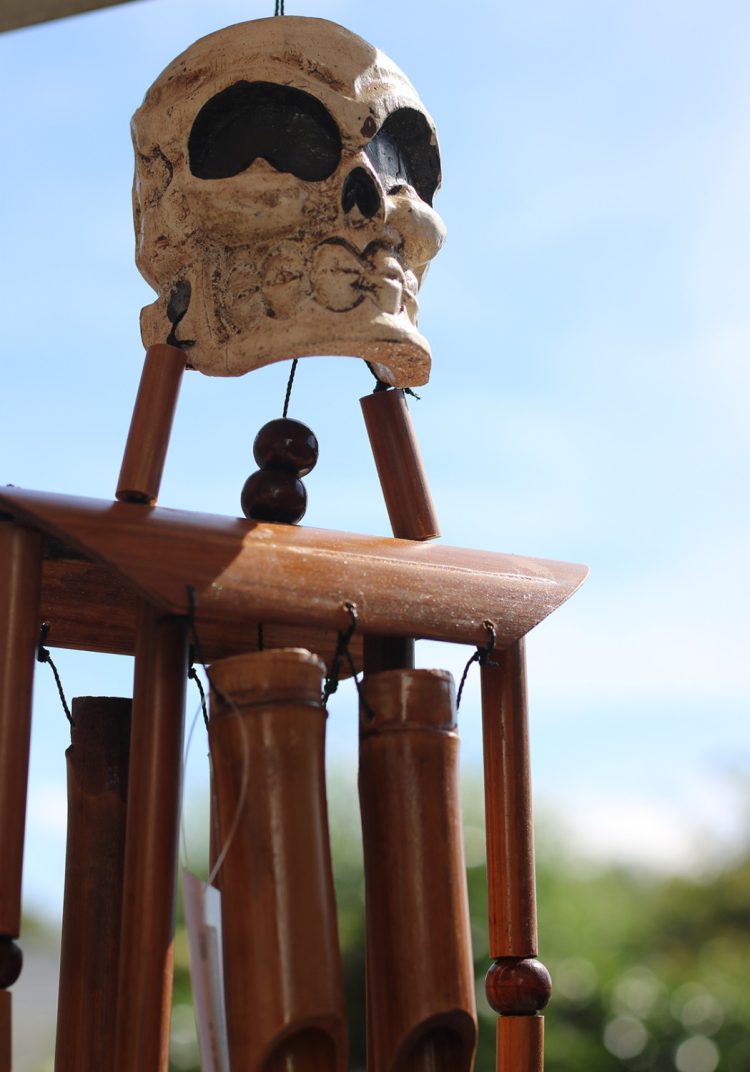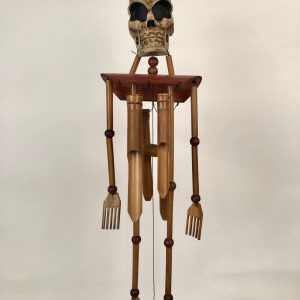 Bamboe windgong skelet naturel, houten schedel met daaronder bamboe stelen in vorm van een skelet, gemaakt in Indonesië. Breedte ± 21cm. Lengte ± 70cm exclusief de klepel.