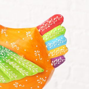 Beeld Kip Gerdi is een kleurrijke en vrolijke decoratie van metaal. Dit handgemaakte en handbeschilderde beeld valt direct op door de frisse kleuren in groen, oranje en rood en de speelse details. De glanzende afwerking geeft het geheel een levendige uitstraling.