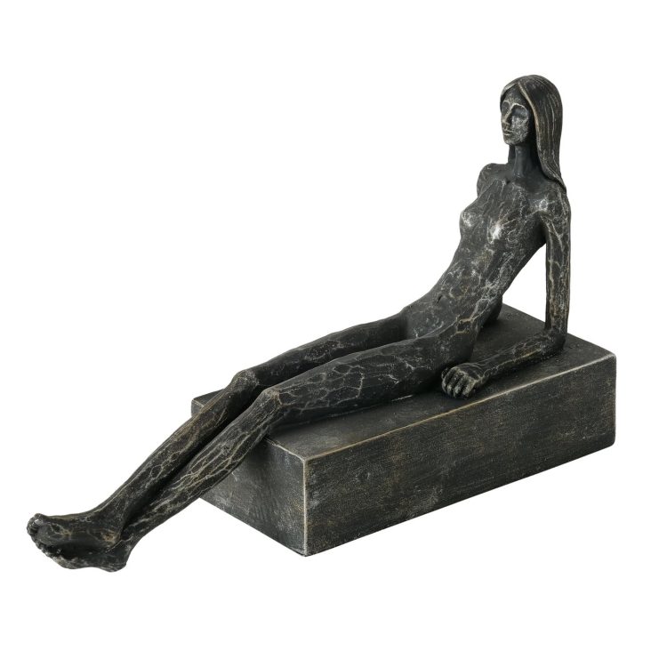 Mooi standbeeldje van vrouw figuur liggend op sokkel. Gemaakt van kunsthars in donkergrijs.