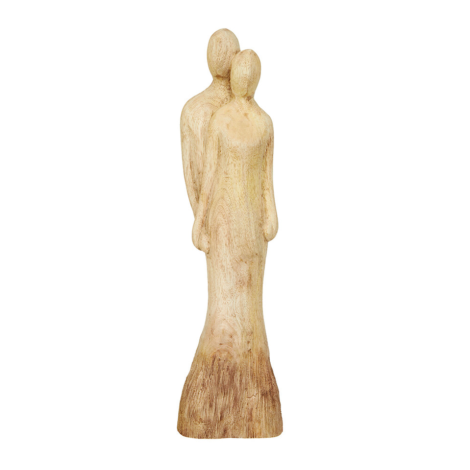 Het beeld is met zorg vervaardigd uit hoogwaardig hout en heeft een naturel afwerking, waardoor de natuurlijke houtnerf prachtig zichtbaar blijft. De twee gestileerde figuren symboliseren verbondenheid en harmonie – perfect voor een sfeervolle en serene inrichting.