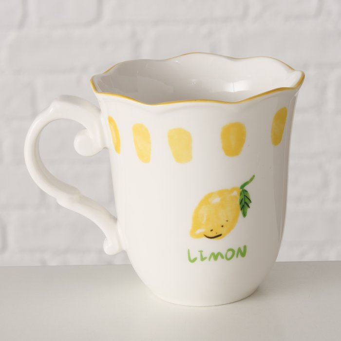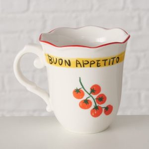 De beker is gemaakt van keramiek en heeft een inhoud van ca. 350 ml. Het ontwerp met citroen- of tomatenmotief en de gekleurde rand zorgen voor een charmant en levendig geheel.
