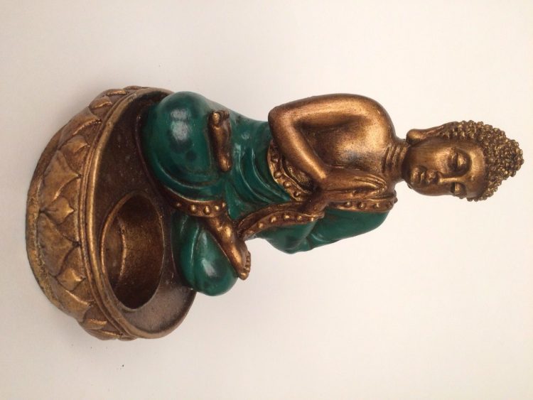 Breng je tuin of woonkamer in serene sfeer met dit biddende Buddha waxinelichtjeshouder gemaakt van kunsthars. Handwerk. Afmeting: ± 18cm hoog.