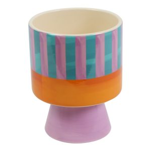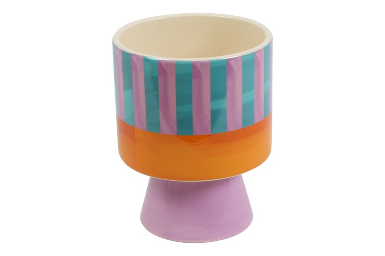 Bloempot Stripes L is een kleurrijke en moderne sierpot die direct sfeer toevoegt aan je interieur. De combinatie van lila, turquoise, oranje en roze strepen geeft deze keramieken bloempot een speelse en eigentijdse uitstraling. Dankzij het unieke ontwerp op voet krijgt jouw plant een extra stijlvolle presentatie.