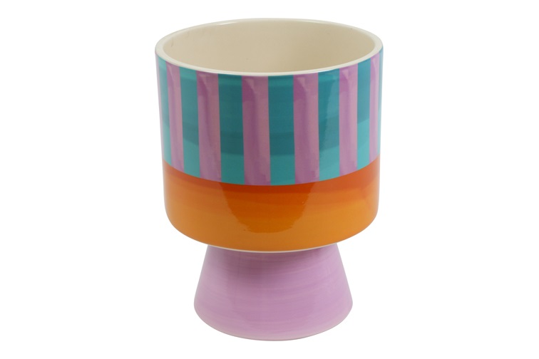 Bloempot Stripes XL is een echte eyecatcher voor een kleurrijk en modern interieur. De combinatie van lila, turquoise, oranje en roze strepen geeft deze keramieken bloempot een speelse en eigentijdse uitstraling. Dankzij het unieke ontwerp op voet krijgt jouw plant letterlijk een podium in huis.