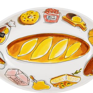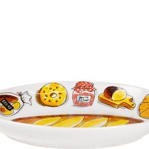 Vers stokbrood, knapperige croissantjes, een stapeltje pancakes of gewoon je fameuze kaasstengels… alles smaakt net iets beter als het geserveerd wordt op deze vrolijke ovale schaal. Met tekeningen van brood in alle soorten en smaken brengt deze schaal de geur van een warme zondagochtend gewoon mee naar tafel. Je hoort de boterhammen al bijna knisperen. Mix en match bijvoorbeeld met de soep items uit de Even Bijkletsen collectie van Blond Amsterdam. Spread love… and a dikke laag boter.