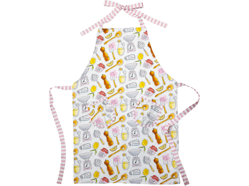 Boter, bloem en een goed gesprek, dat zijn de echte ingrediënten voor een geslaagde bakdag. Met dit vrolijke schort uit de Even Bijkletsen collectie sta je niet alleen lekker te kliederen in de keuken, maar zie je er ook nog eens uit om door een (taart)ringetje te halen. Het illustratieve ontwerp vol keukenklassiekers als de garde, rasp, citroen en weegschaal is een ode aan de kunst van het bakken… en het belang van even kletsen tussendoor. Want eerlijk is eerlijk: samen bakken is dubbel zo leuk. Gemaakt van stevig katoen, met een handig zakje voor je lepel, spiekbriefje of iets lekkers voor tussendoor. Ideaal voor keukenprinsen, bakfeeën en iedereen die dol is op deeg én gezelligheid. Combineer hem met de bijpassende theedoek, ovenwanten en het tafelkleed uit de Even Bijkletsen collectie.