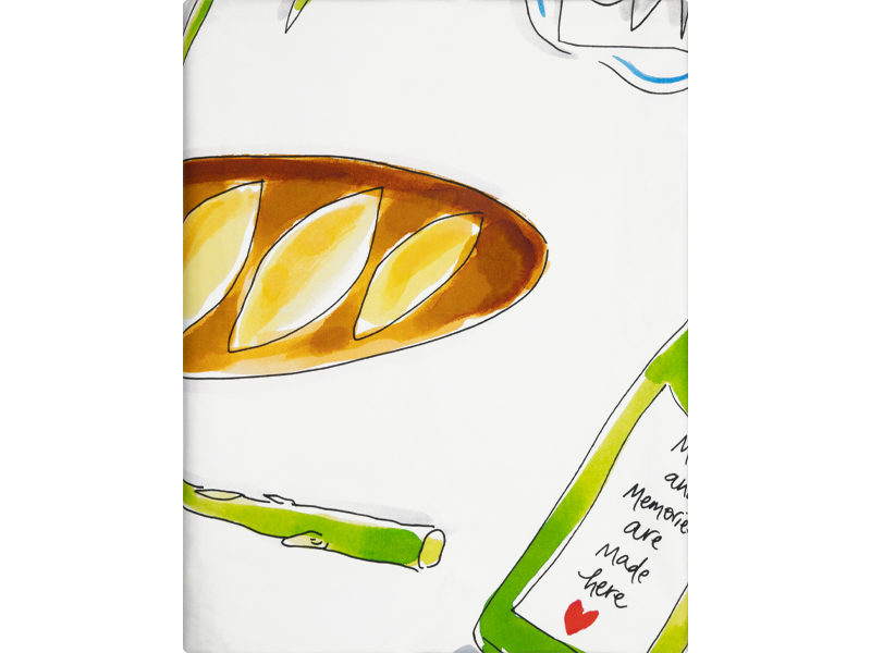 Waar gelachen wordt, wordt geleefd. En waar gegeten wordt… daar ligt dit vrolijke tafelkleed. Uit de Even Bijkletsen collectie komt dit katoenen kleed vol illustraties van alles wat je keukenhart sneller laat kloppen: een verse baguette, een tomaat met karakter, en een wijnfles met wijze woorden (Meals and memories are made here). Want aan tafel ontstaan de mooiste herinneringen. Van knoeiende kids tot nachtelijke wijntjes met je beste vriendin. Perfect voor lange ontbijtsessies, borrelplanken met verhalen of een doordeweekse pasta met een goed gesprek. Bon appétit! Combineer hem met de ovenwanten, theedoeken en het short uit de Even Bijkletsen.