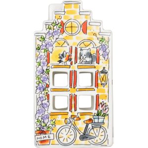 Een huisje om in te wonen? Nee hoor, dit huisje is er om in weg te dromen. Met z’n vrolijke trapgevel, bloemetjes voor het raam en een keuken waar de taart altijd net uit de oven lijkt te komen, straalt dit aardewerk lichthuisje pure gezelligheid uit. Zet er een waxinelichtje in en zie hoe de ramen warm oplichten, alsof er binnen iemand staat te roeren in de pan en op je wacht met een dampende kop thee. Dit is home sweet home op z’n Blondst. Perfect voor op de vensterbank, je bijzettafel of naast de theepot. Ontdek meer items uit de Even Bijkletsen collectie van Blond Amsterdam.