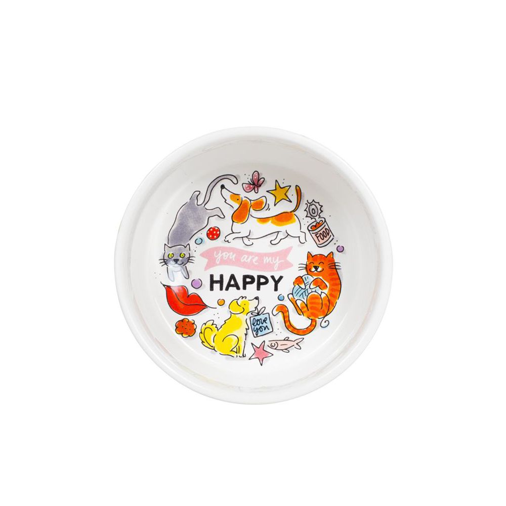 This makes me and my pet happy! Deze vrolijke voerbak, maakt jouw huis en het eten van jouw huisdier nog gezelliger! De opvallende en kleurrijke illustraties zijn in het thema Happy ontworpen. Op voerbak staan allemaal illustraties van honden en katten aan de binnenkant met de tekst: ‘You are my happy’ en groene strepen aan de buitenkant.