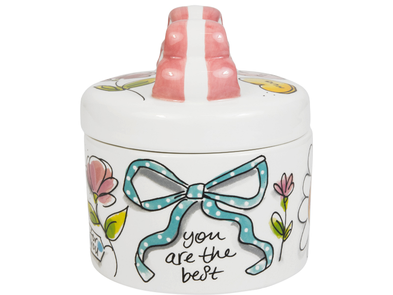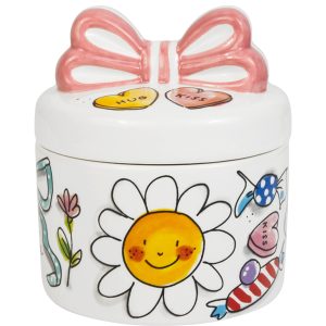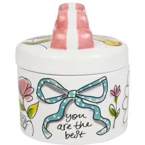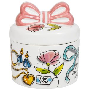 Sommige cadeaus verdienen een strik. Dit keramieken doosje ís de strik. Dit sieradendoosje van 10 cm lang en breed en 6 cm hoog met 3D strik is een echte eyecatcher uit de Blond Amsterdam Moederdag collectie. Perfect voor oorbellen, ringen of kleine herinneringen. Zet het op haar nachtkastje, bureau of kaptafel en elke dag wordt net een beetje feestelijker. Klein doosje. Grote liefde. Laat dit product personaliseren met een naam of boodschap in ons atelier en maak er een echt persoonlijk cadeau van. Houd bij personalisatie rekening met een iets langere levertijd. De tekst komt op de zijkant van de deksel. Om de kwaliteit van de opdruk te behouden, raden we aan om de keramische producten met de hand af te wassen.