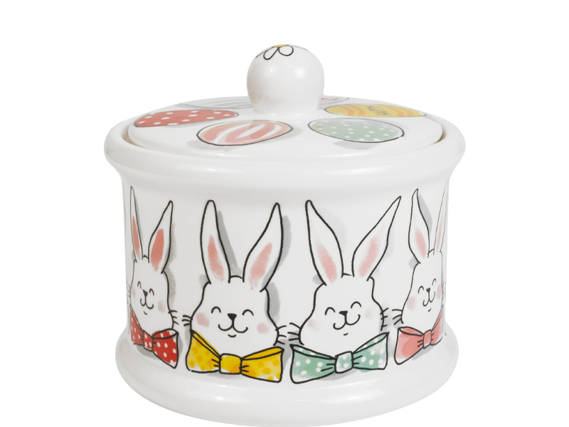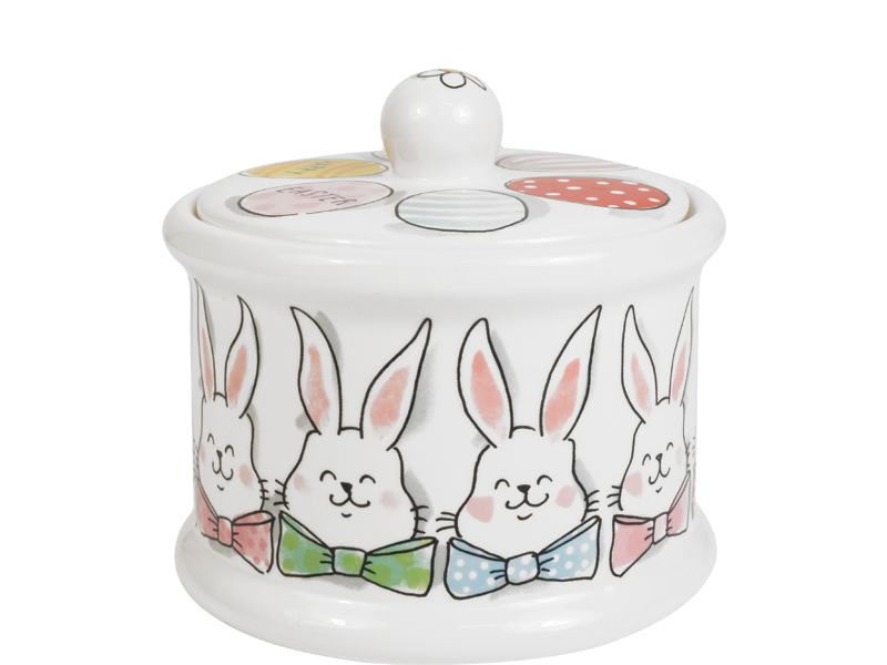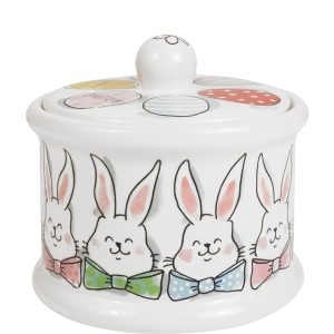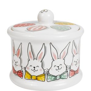 De Voorraadpot rond 12,5 cm Pasen Paashazen van Blond Amsterdam is een vrolijke toevoeging aan de keuken tijdens Pasen. Rondom de pot staan handgetekende paashazen met strikjes, afgewisseld met gekleurde paaseitjes. Zelfs de deksel doet gezellig mee. De voorraadpot is gemaakt van aardewerk en heeft een bijpassende deksel. Ideaal voor het bewaren van paaseitjes, koekjes, suiker of ander lekkers. Dankzij het compacte formaat staat deze pot mooi op het aanrecht, de ontbijttafel of in een open kast. You name it! Combineer de voorraadpot met andere items uit de Blond Amsterdam Pasen collectie voor een samenhangend geheel. Ook geschikt als paas cadeau, want deze paashazen passen graag op de voorraad!