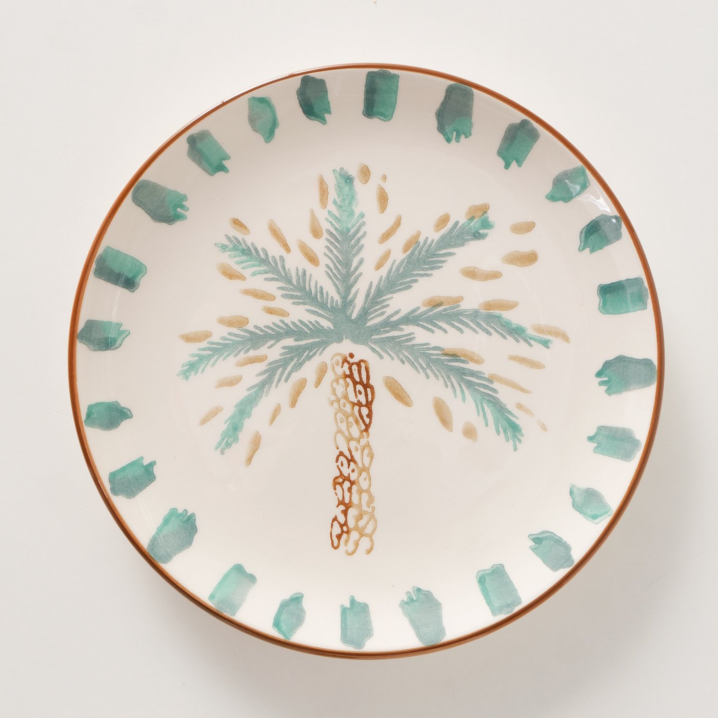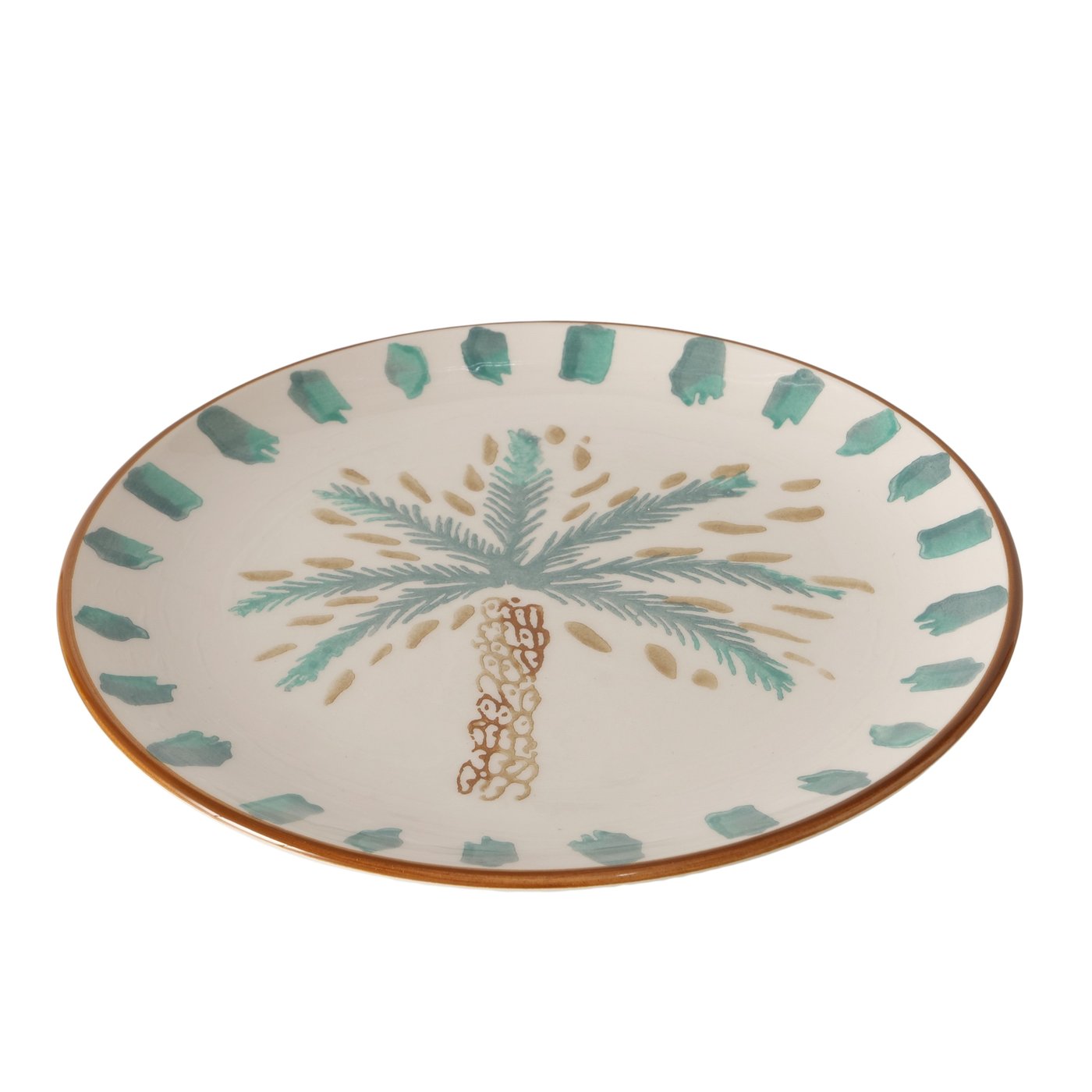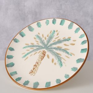 Keramieken bord met handbeschilderd palmboommotief en geglazuurde afwerking.