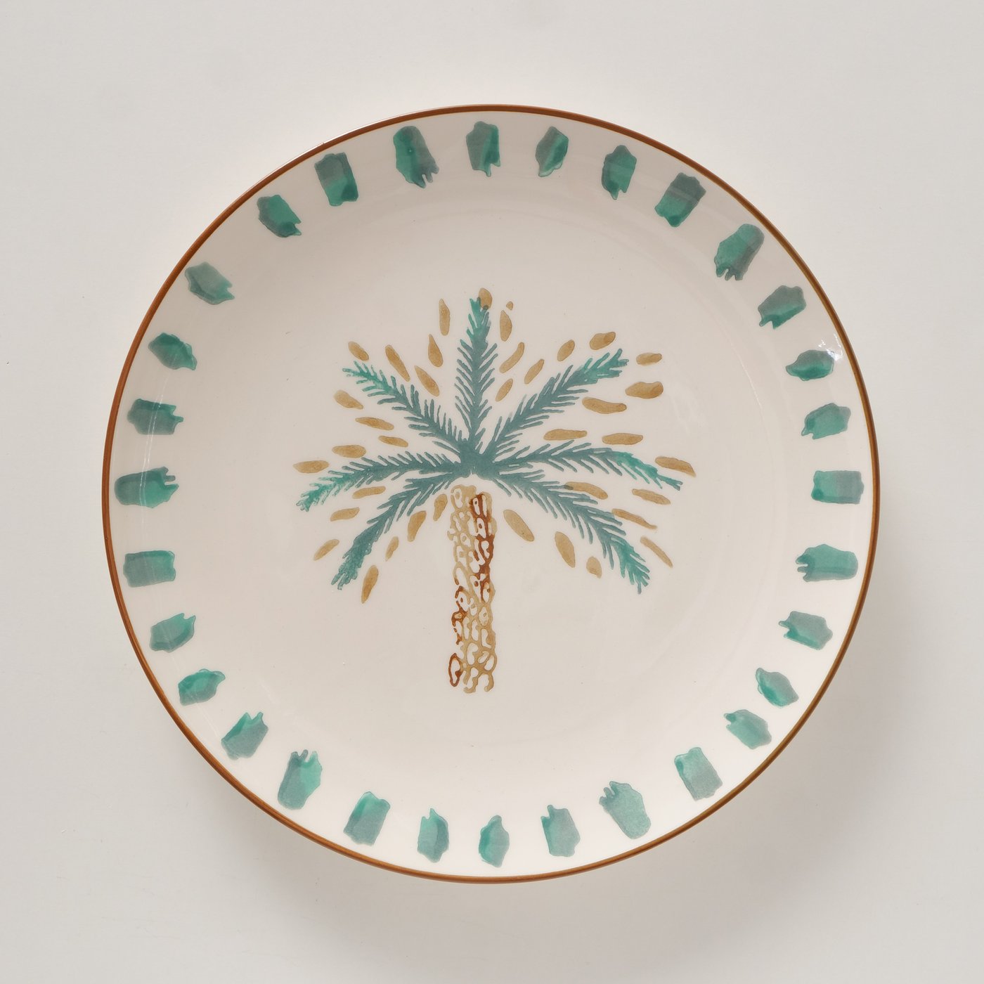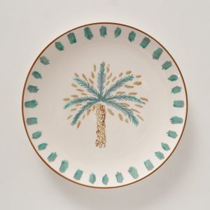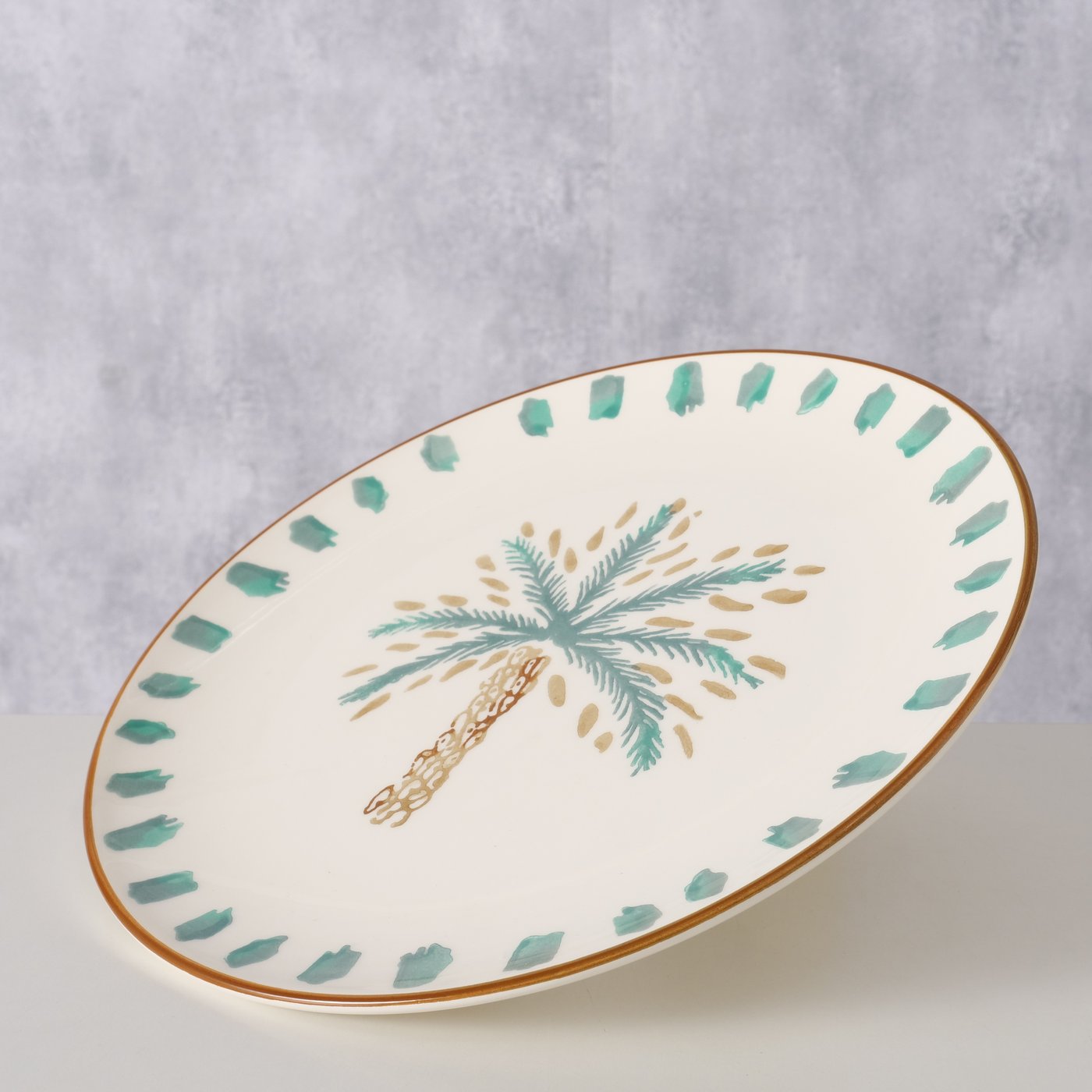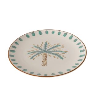 Het grote bord palmizio brengt een warme, zomerse sfeer op tafel dankzij het handbeschilderde palmboommotief. Dit sierlijke bord is gemaakt van hoogwaardig keramiek en heeft een glanzende geglazuurde afwerking. Perfect als serveerbord, dinerbord of decoratief stuk op een tafel, plank of open kast.