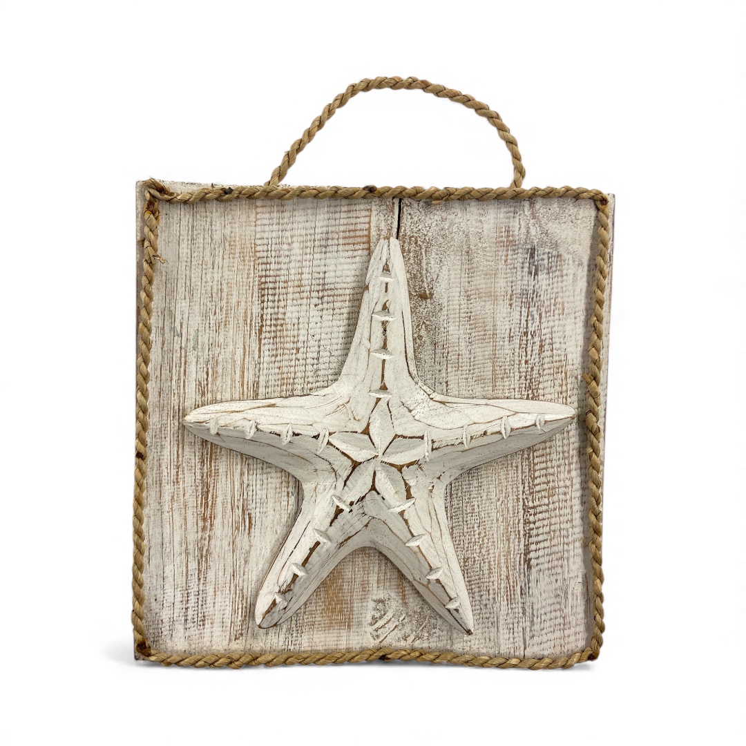 Decoratief bordje van ca. 20×20?cm met touw en een witte zeester. Dit handgemaakte item brengt een charmante, nautische touch in je interieur en past perfect in een beach, coastal of landelijke woonstijl. Ideaal om neer te zetten op een dressoir, plank of als onderdeel van een sfeervolle wanddecoratie.