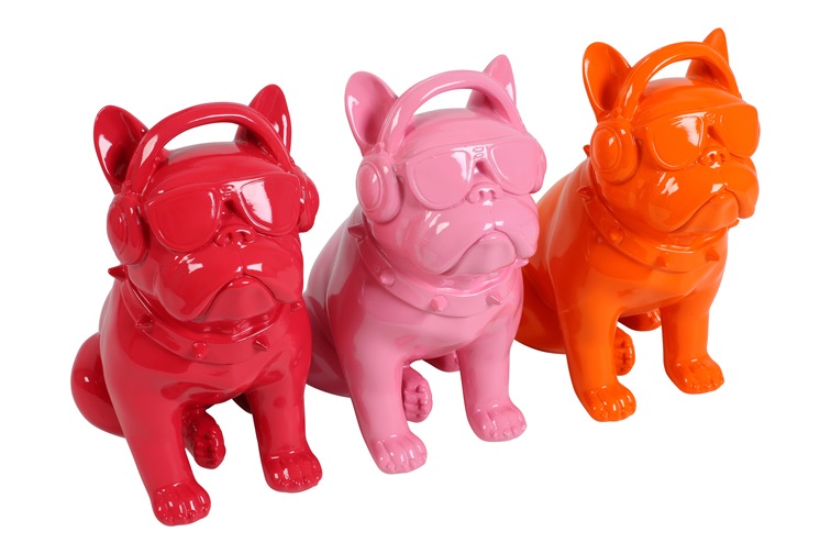 Buldog Bico is een opvallend en modern decoratiebeeld met een speelse uitstraling. De stoere buldog draagt een koptelefoon en zonnebril, wat zorgt voor een trendy en eigenzinnig karakter. De glanzende afwerking in oranje, fuchsia of roze maakt dit beeld een echte blikvanger in elk interieur.