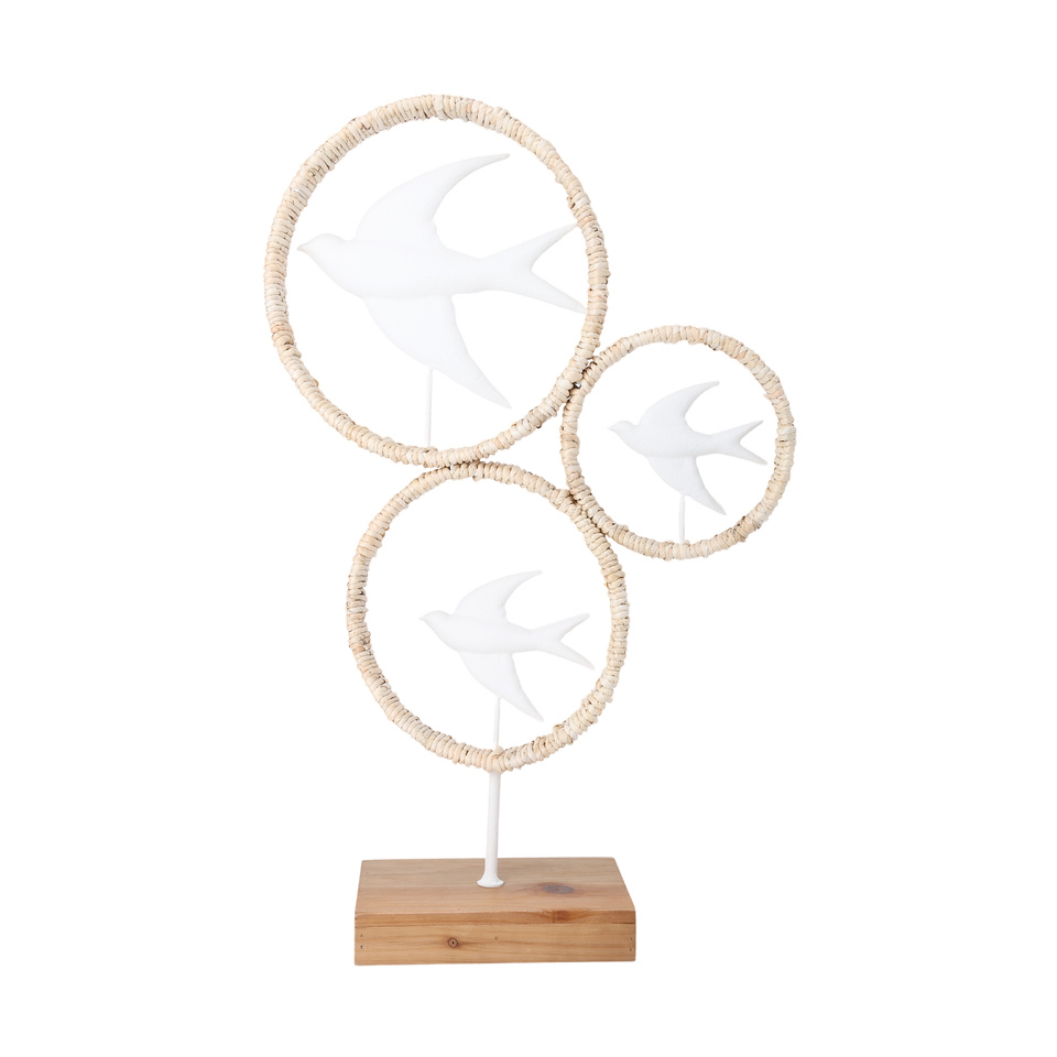 Deze stijlvolle staande decoratie combineert speelse elegantie met natuurlijke materialen. De sierlijke witte metalen vogels lijken lichtjes te zweven binnen verfijnde cirkels die subtiel zijn omwikkeld met touw. Het contrast tussen het strakke metaal en de warme, natuurlijke textuur van het touw geeft het object een rustige en harmonieuze uitstraling.
