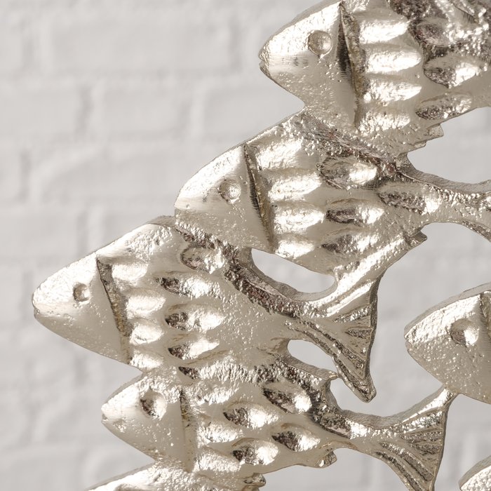 Decoratief object Feodor is een stijlvol beeld met een school vissen die samen een speels en dynamisch geheel vormen. De combinatie van zilverkleurige vissen en een natuurlijke houten voet zorgt voor een mooi contrast en een moderne uitstraling.