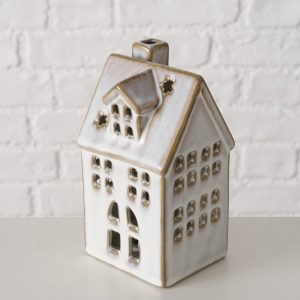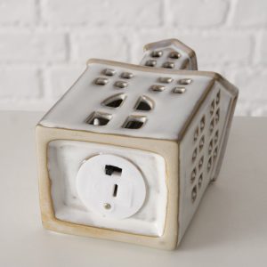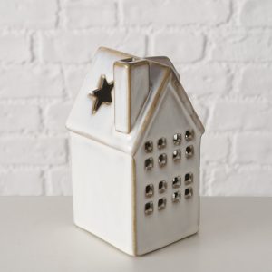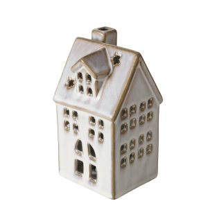 Breng warmte, licht en gezelligheid in huis met dit keramieken huisje voor een theelichtje. Het witte glazuur straalt rust en eenvoud uit, terwijl de subtiele bruine accenten zorgen voor een knusse, landelijke uitstraling.