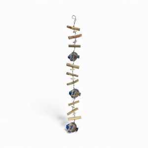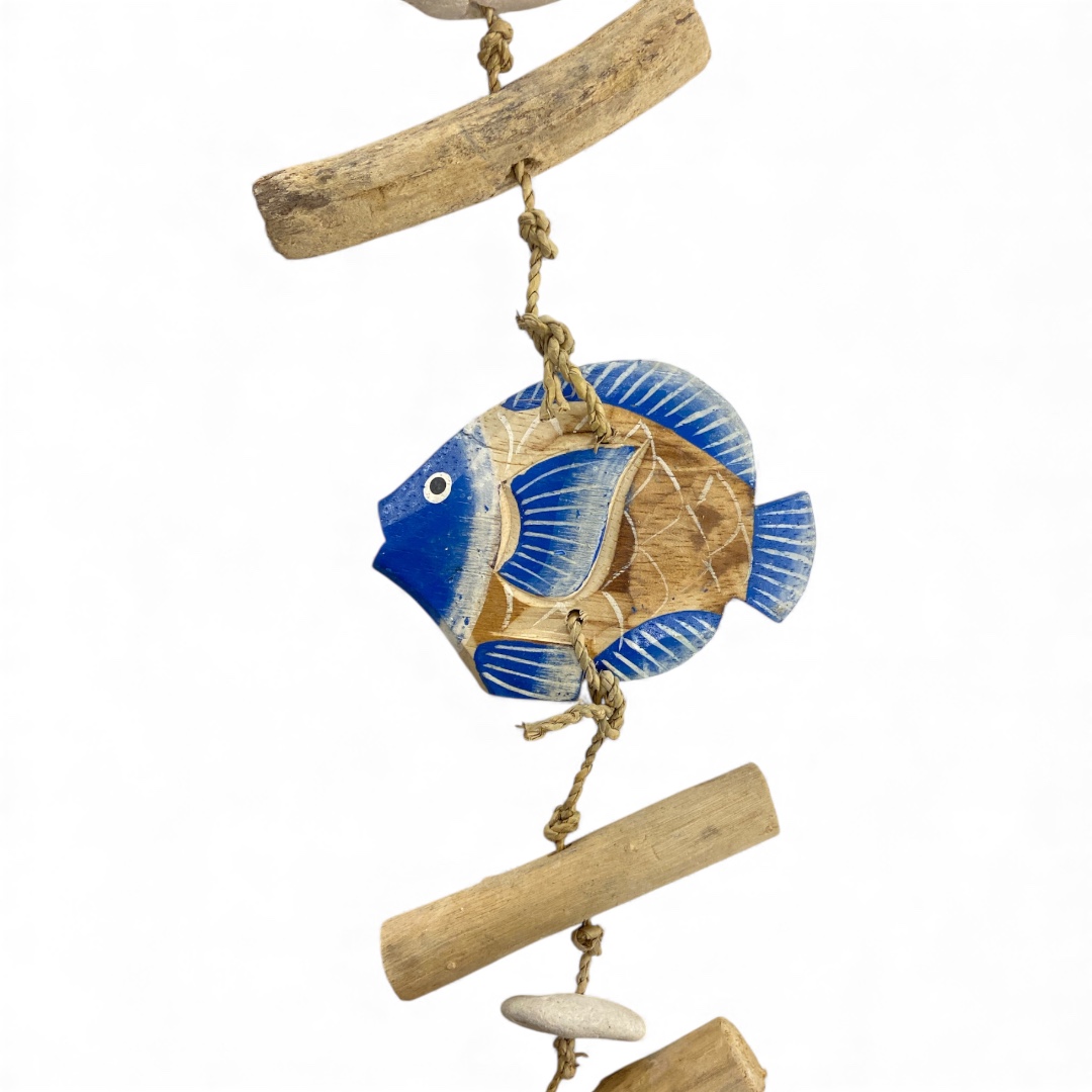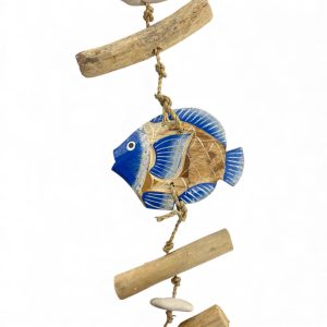 Drijfhouthanger met drie Nemo-visjes in donkerblauw, verbonden met touw en houten kralen. Dit handgemaakte item brengt een speels en natuurlijk accent in je interieur en past perfect in een beach, coastal of landelijke woonstijl. Leuk om op te hangen aan een wandhaak, deur, veranda of onder een overkapping als sfeervolle wanddecoratie.