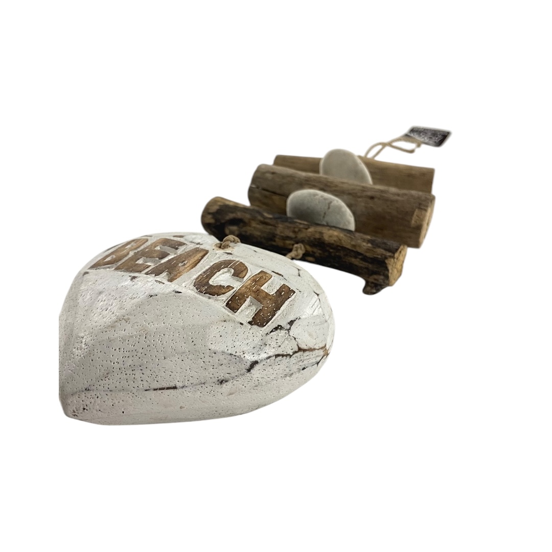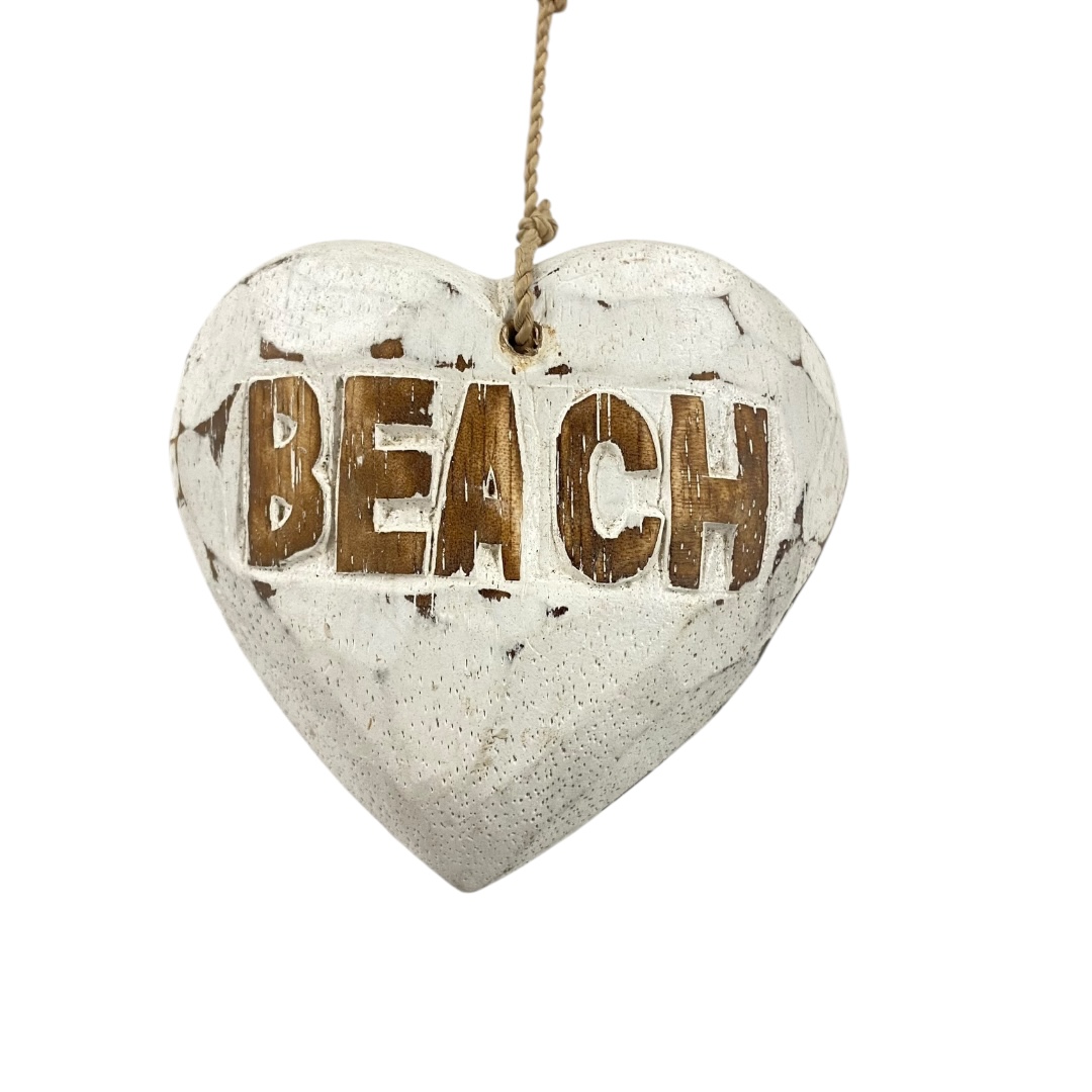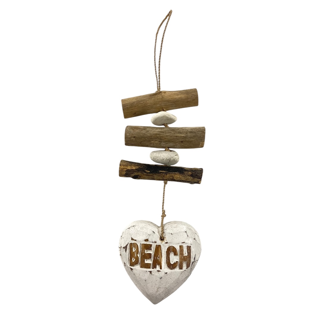 Deze handgemaakte drijfhouthanger met houten hart “Beach” brengt een zomers en rustgevend kustgevoel in huis.