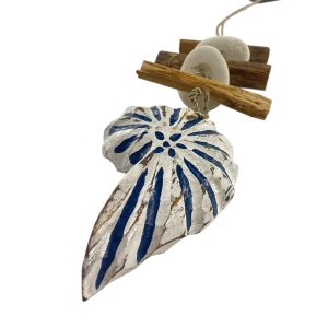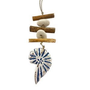 De combinatie van natuurlijk drijfhout, touw en een wit-blauw gestreepte schelp zorgt voor een zomerse, maritieme uitstraling die perfect past bij een strandstijl interieur of veranda.