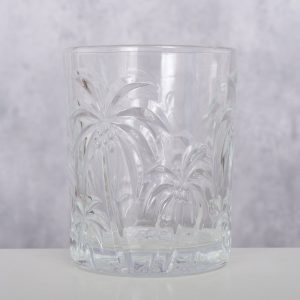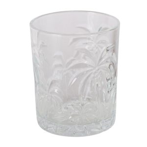 Het Drinkglas Lapalma is een sfeervol glas met een subtiel reliëf van palmbladeren. Het heldere glas in combinatie met het tropische patroon geeft een zomerse, elegante uitstraling aan elke tafelsetting. Met een inhoud van ca. 300 ml is dit glas ideaal voor water, frisdrank of cocktails. Stevig, stijlvol en geschikt voor dagelijks gebruik of voor een mooi gedekte tafel.