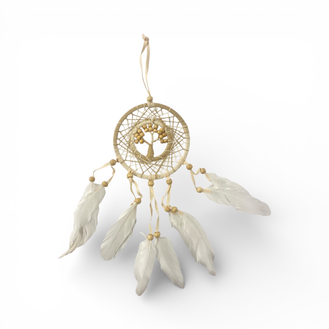 Deze dromenvanger met levensboom heeft een diameter van ca. 12 cm en een totale lengte van ca. 37 cm. De levensboom is verwerkt in een naturel ring en vormt samen met het fijne web een rustig en harmonieus geheel. De witte veren onderaan zorgen voor een zachte, lichte uitstraling die mooi past bij verschillende interieurstijlen.