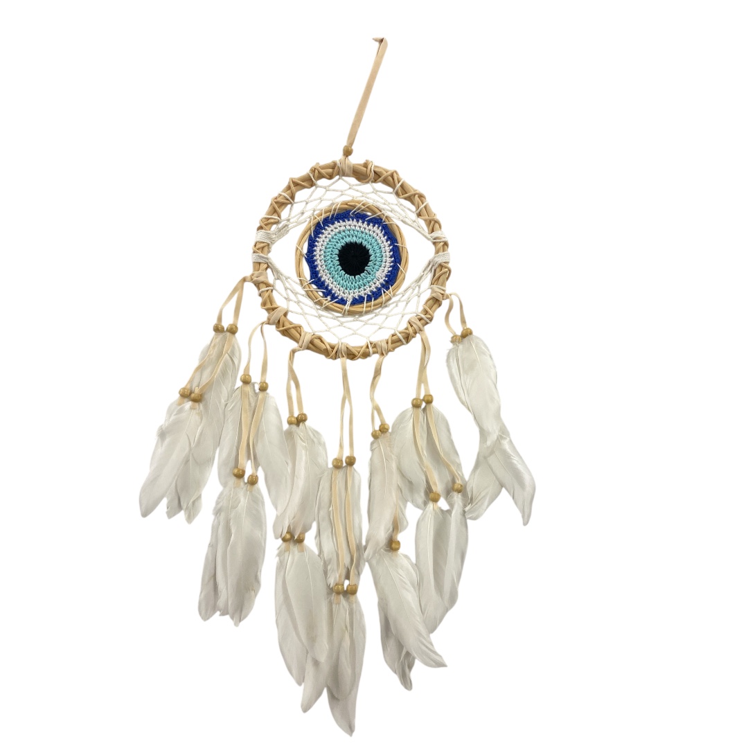 Deze dromenvanger met oogmotief heeft een diameter van ca. 16 cm en een totale lengte van ca. 60 cm. De houten ring vormt een stevig en natuurlijk kader voor het web en het oog in het midden. De witte veren die onderaan hangen zorgen voor een zachte en rustige uitstraling.
