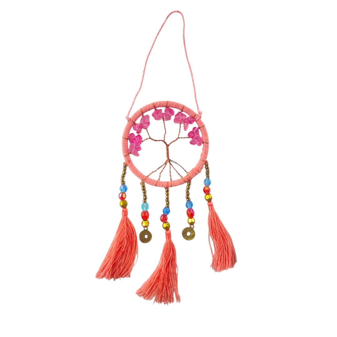 Deze dromenvanger met levensboom heeft een diameter van ca. 6 cm en een totale lengte van ca. 22 cm. In het midden is een levensboom verwerkt met een glaskraal als subtiel accent, wat zorgt voor een verfijnd en rustig detail. De hangende elementen geven de dromenvanger een lichte en speelse uitstraling.