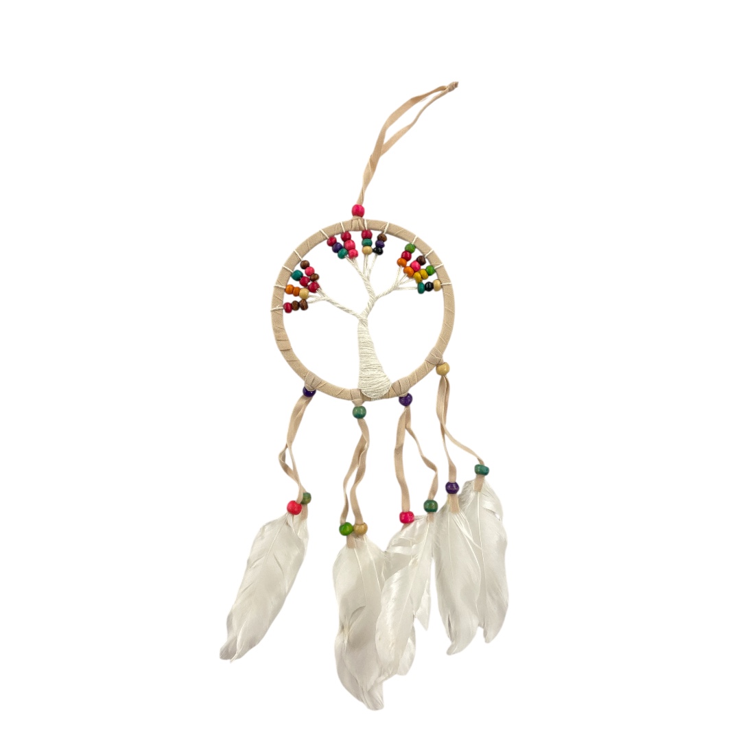 Deze dromenvanger met levensboom heeft een diameter van ca. 12 cm en een totale lengte van ca. 40 cm. De levensboom is afgewerkt met multicolor kralen, wat zorgt voor een speels en levendig accent in het ontwerp. De witte veren onderaan geven de dromenvanger een zachte en luchtige uitstraling.