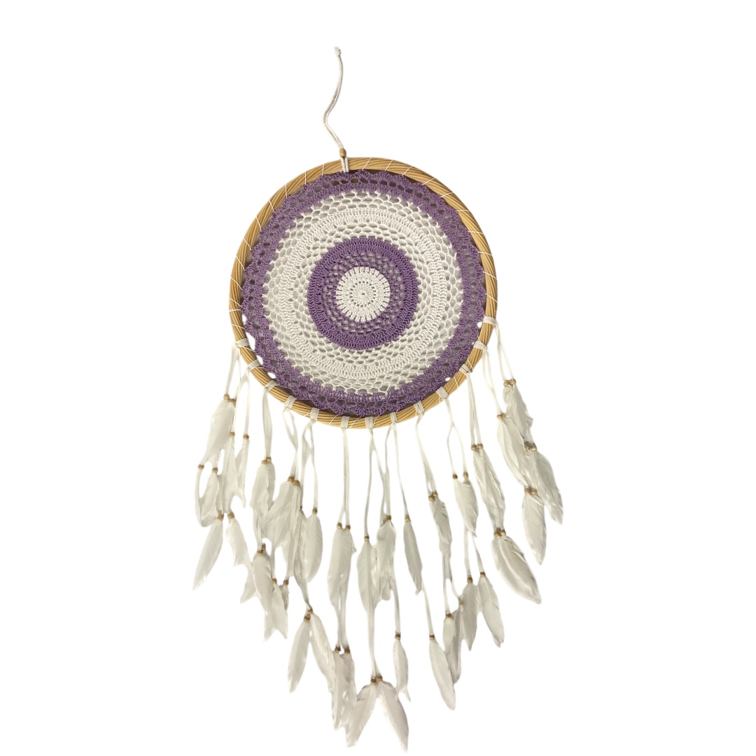 Deze dromenvanger met witte veren heeft een diameter van ca. 40 cm en een totale lengte van ca. 110 cm. Het ronde midden is uitgevoerd in zachte pastel paars en wit, wat zorgt voor een rustige en harmonieuze uitstraling. De lange, witte veren geven de dromenvanger een licht en sierlijk effect dat mooi meebeweegt in de ruimte.