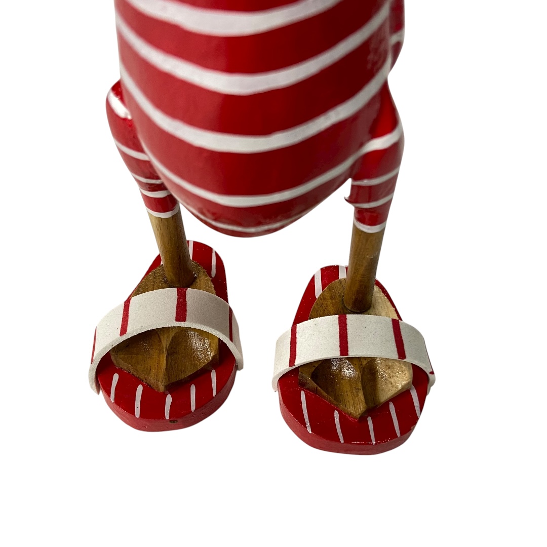 Met haar rood-wit gestreepte badpak, hoedje en slippers ziet ze eruit alsof ze zo van het strand komt, een speelse en charmante toevoeging aan elk interieur.
