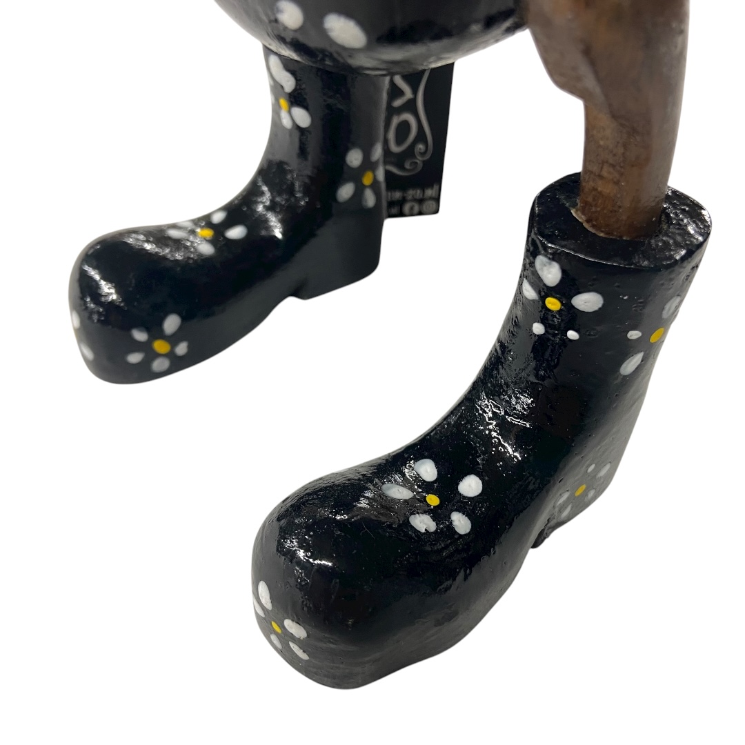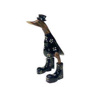 De zwarte kleur met subtiel witte bloemenprint en bijpassende laarsjes geeft dit decoratieve eendje een chique, maar vrolijke uitstraling, perfect voor in de woonkamer, hal of vensterbank.
