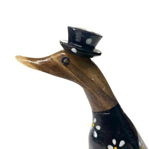 Deze stijlvolle handgemaakte houten eend “Flowershoes” zwart combineert elegantie met een vleugje speelsheid.