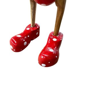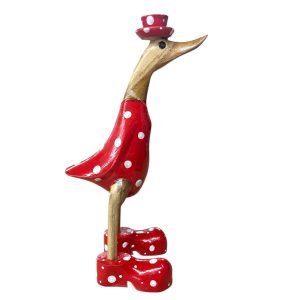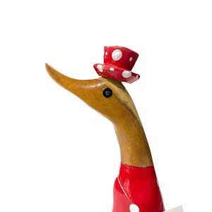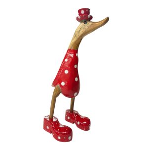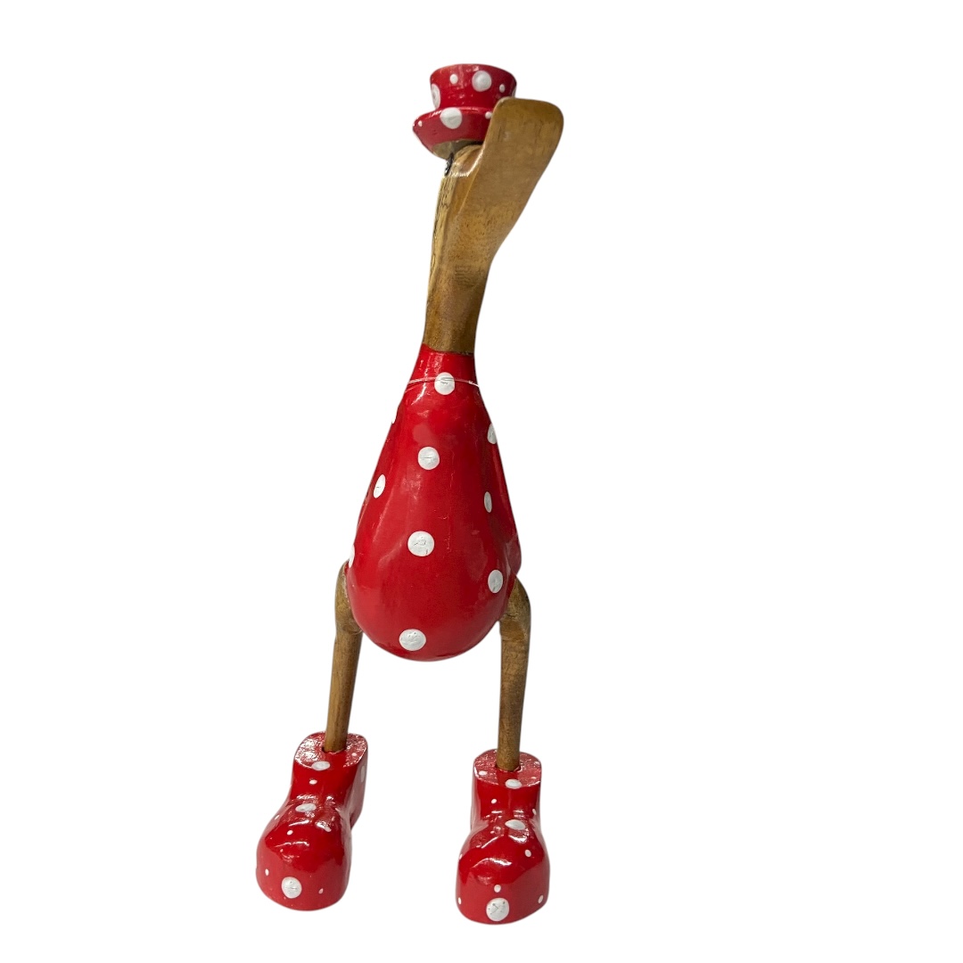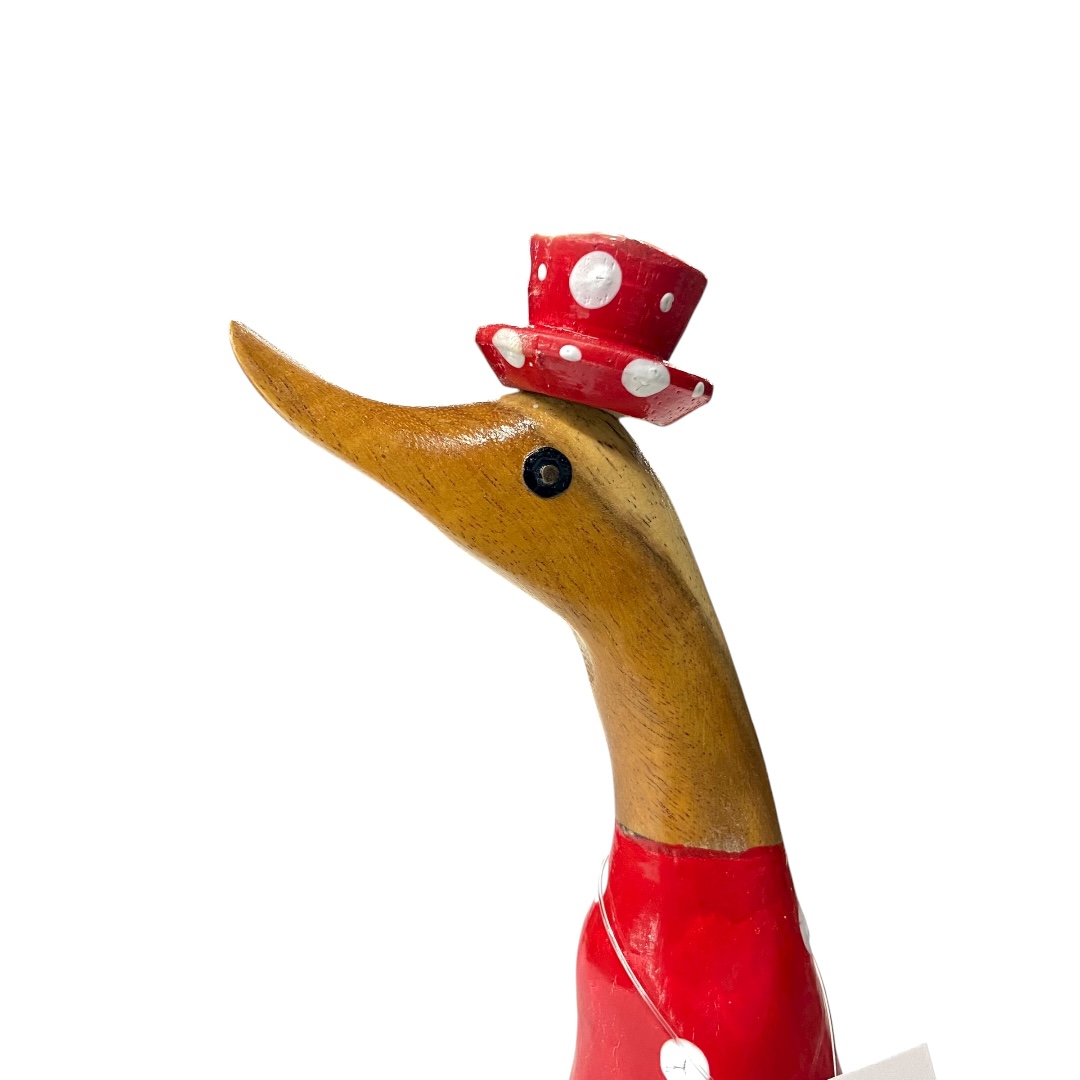 Deze vrolijke houten eend uit Indonesië valt direct op met haar speelse rode outfit met witte stippen en bijpassend hoedje. Een echte blikvanger die sfeer en humor toevoegt aan elk interieur.