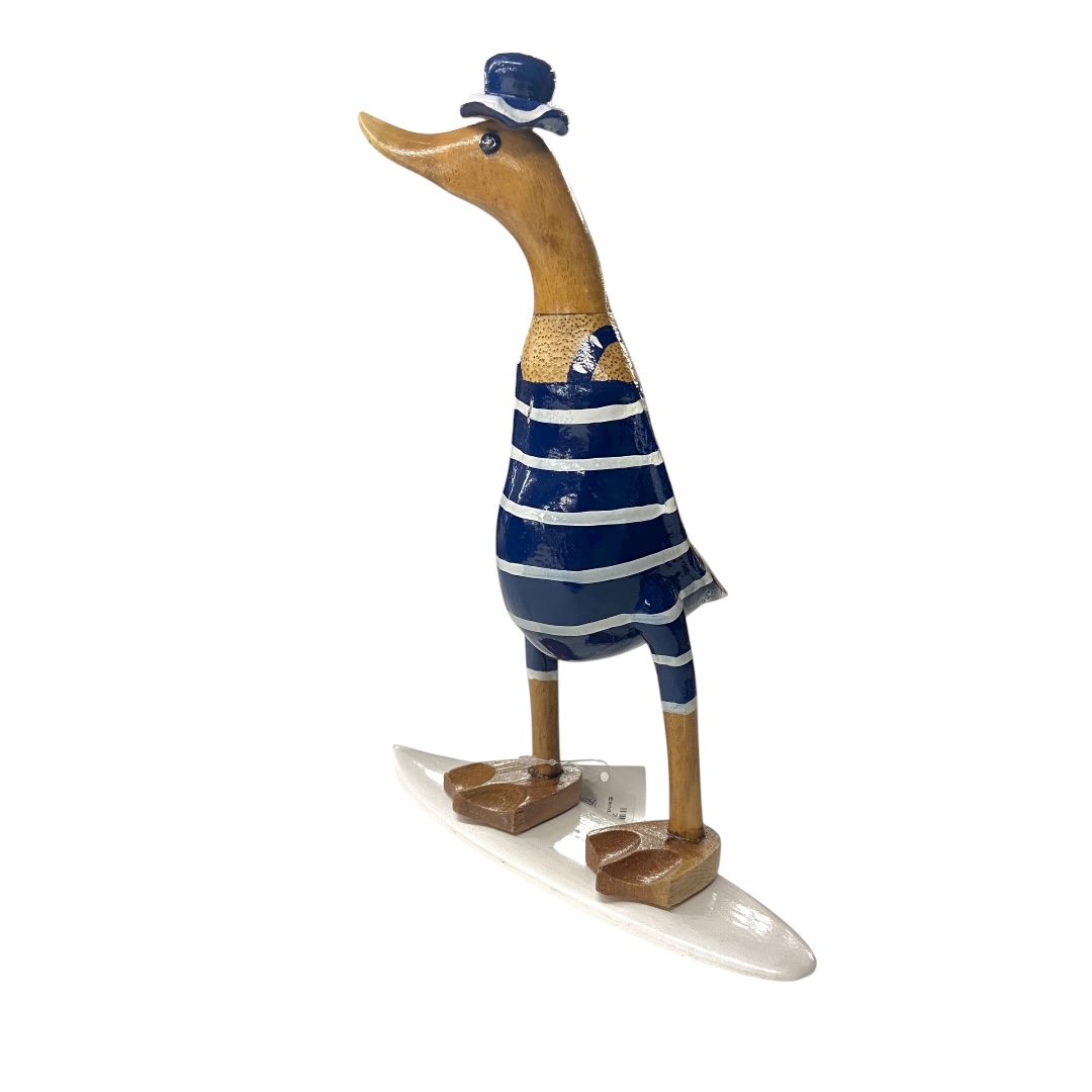 Deze handgemaakte houten eend “Surfgirl” brengt direct een vleugje zomer in huis.