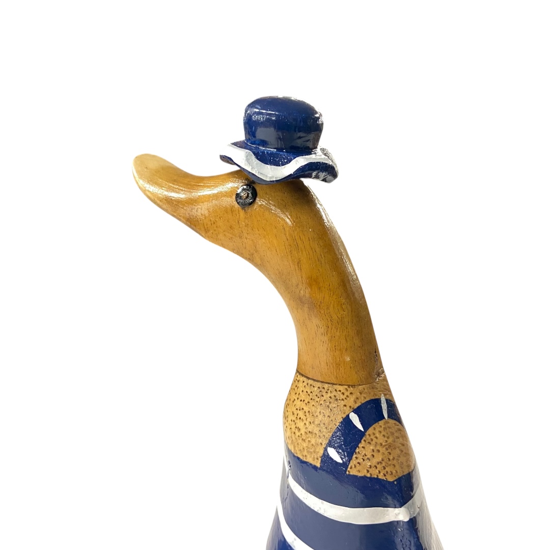 Elke eend wordt met zorg met de hand gemaakt door ambachtslieden in Indonesië, waardoor elk stuk zijn eigen karakter heeft. Het natuurlijke hout zorgt voor een warme uitstraling en maakt haar een unieke decoratie voor in huis, op het terras of in een strandthema-interieur.