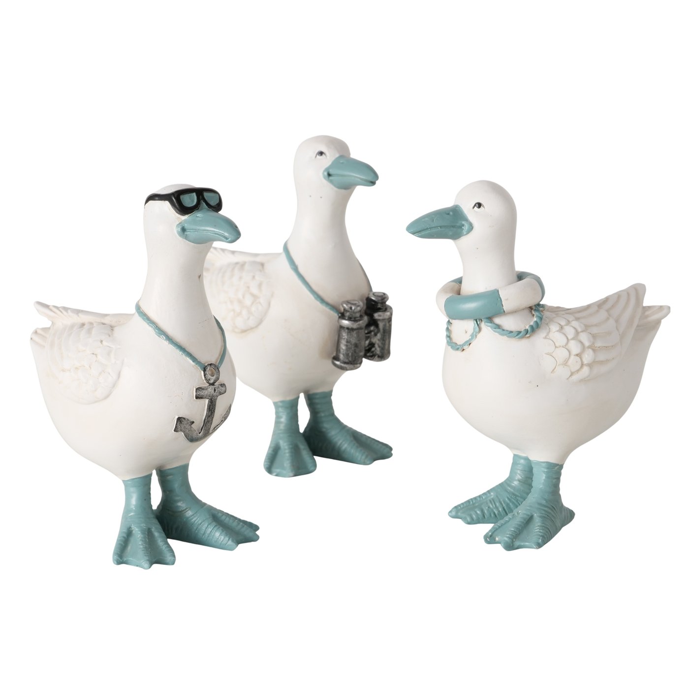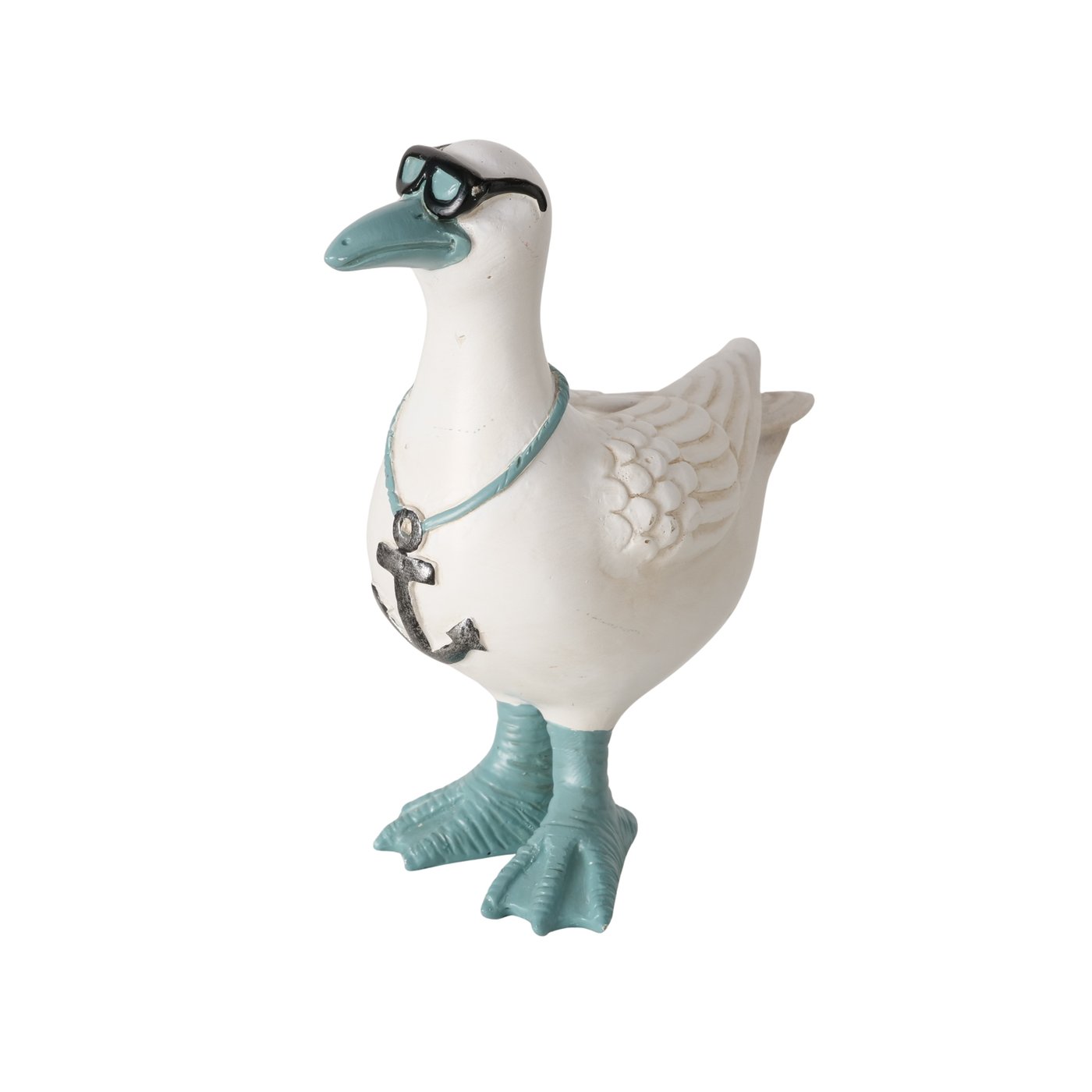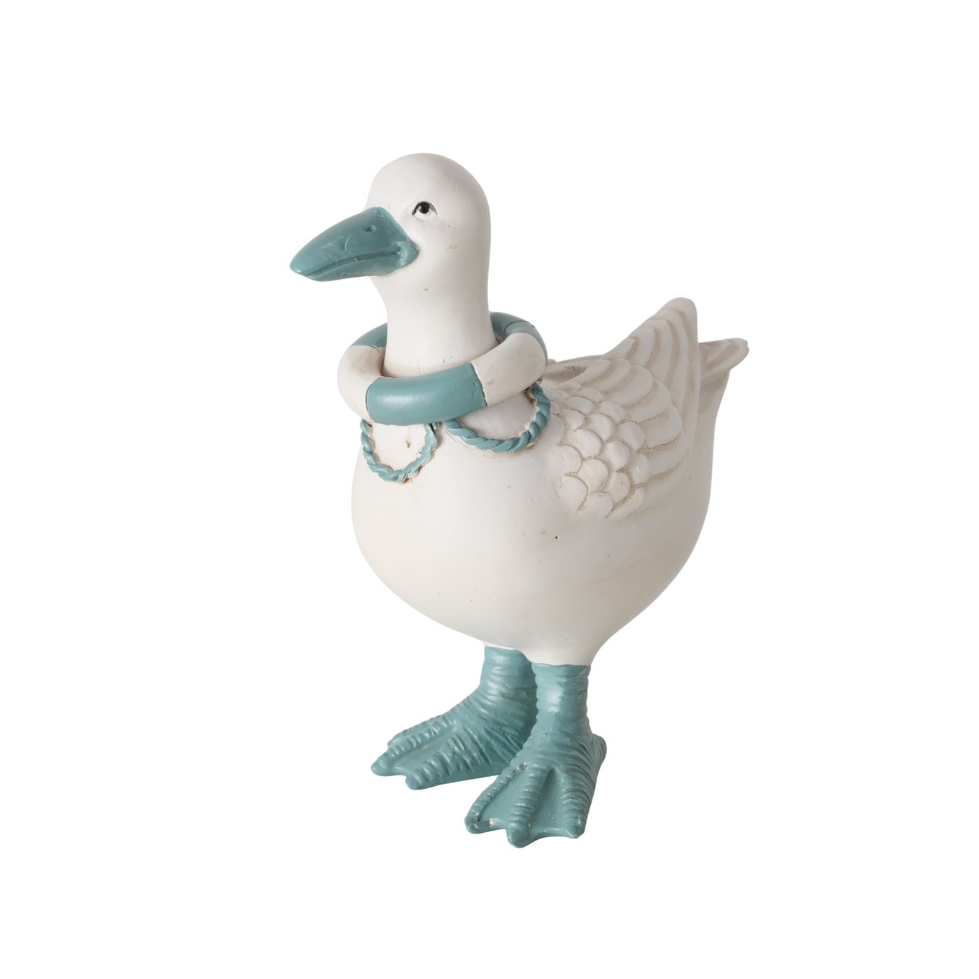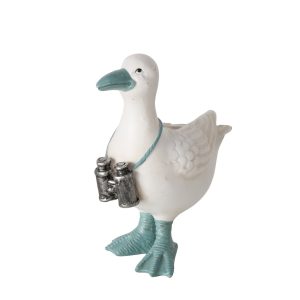 Het beeldje is gemaakt van polyresin en met de hand beschilderd. De combinatie van wit met blauwe accenten zorgt voor een frisse uitstraling die perfect past bij een maritiem of strandachtig interieur.
