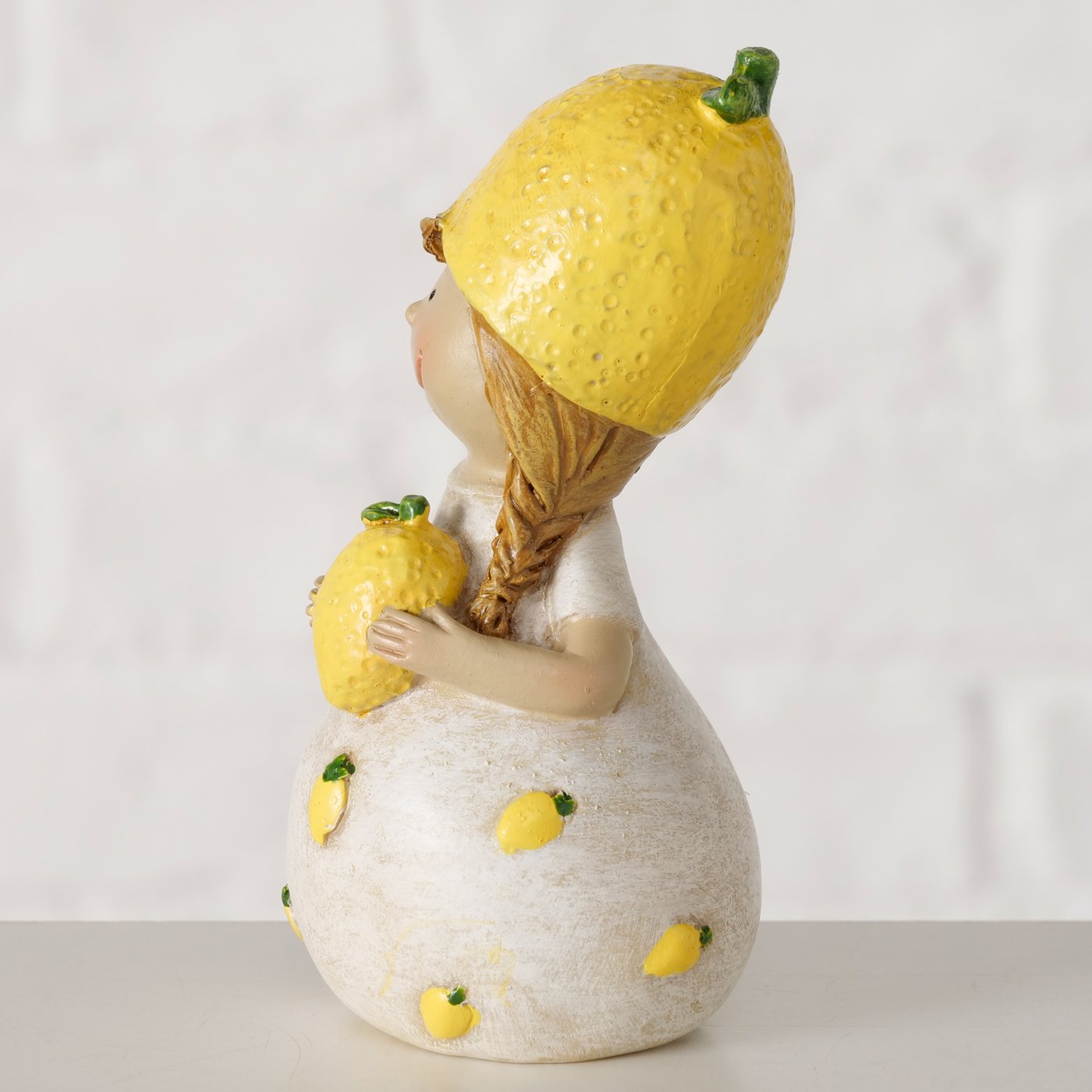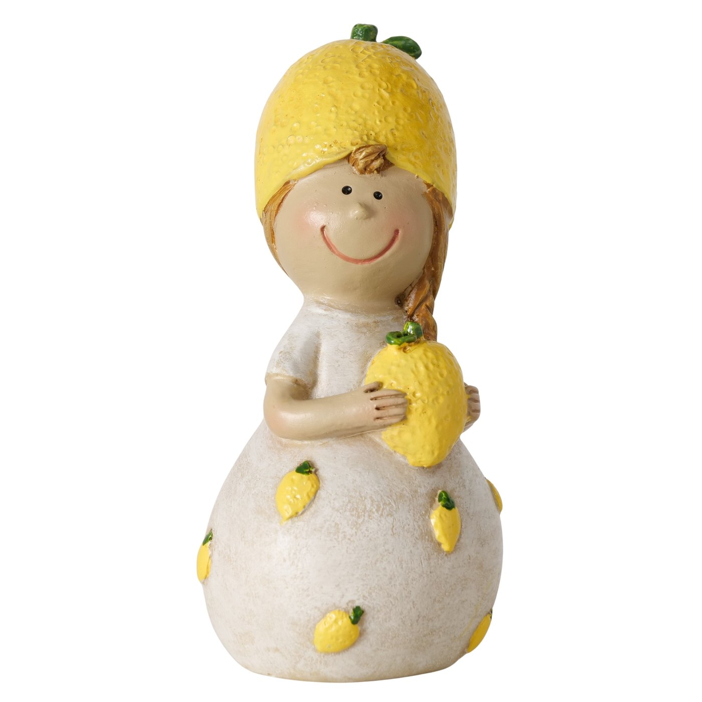 Dit vrolijke decoratieve beeldje van een meisje met citroen brengt direct een frisse en zomerse sfeer in huis. Het figuurtje draagt een citroenhoed en houdt een citroen vast, terwijl kleine citroendetails in de jurk zijn verwerkt. Hierdoor krijgt het beeldje een speels en mediterrane uitstraling.