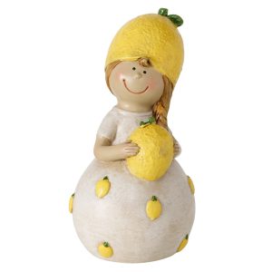 Het beeld is gemaakt van polyresin en is met de hand beschilderd, waardoor het een mooie afwerking en karaktervolle uitstraling heeft. De decoratieve citroenen op het jurkje en de grote citroen in haar handen maken dit beeld een opvallend en charmant woonaccessoire.