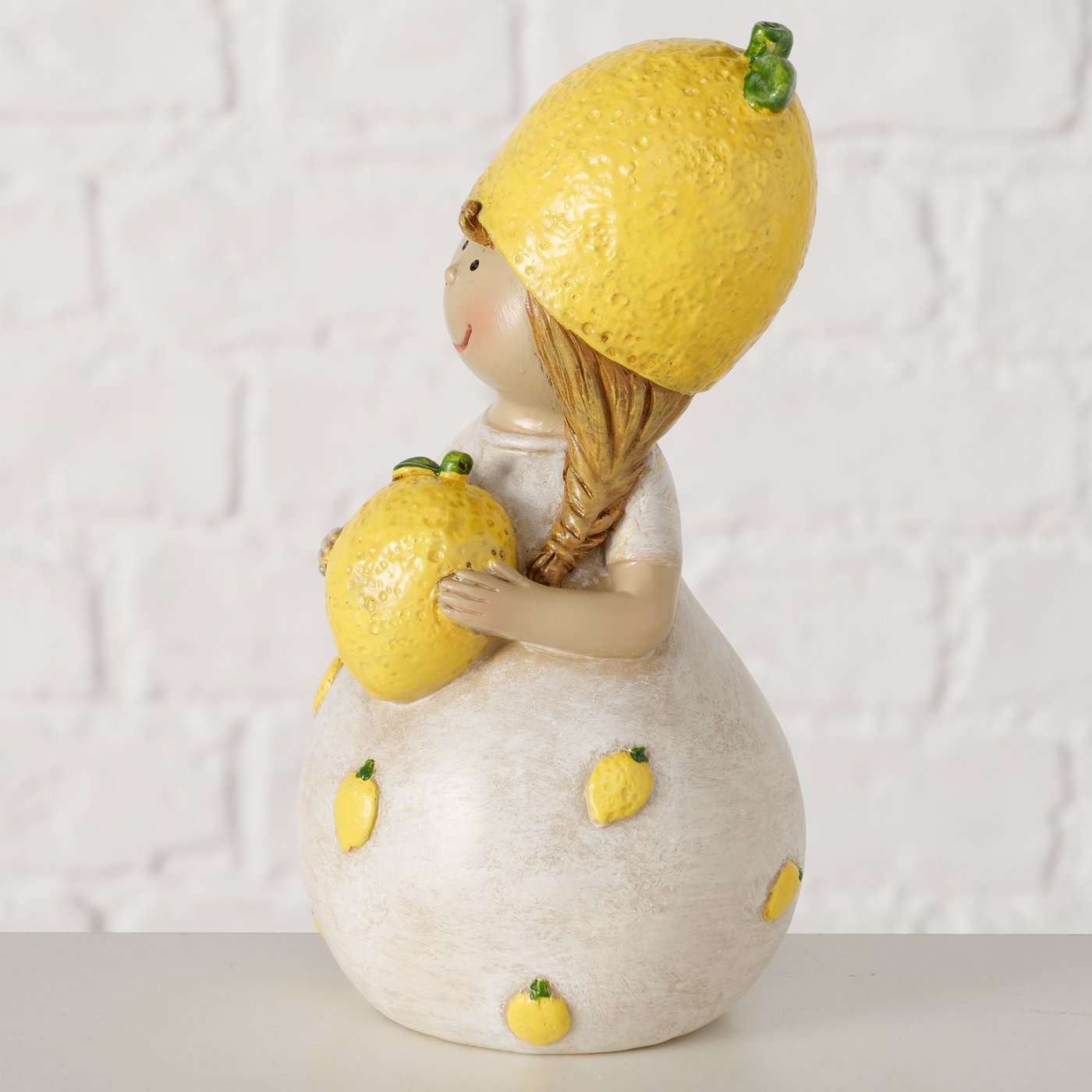 Figuur Zitrone is een vrolijk decoratiebeeld van een meisje dat een grote citroen vasthoudt. De zachte kleuren en speelse citroendetails geven het beeld een frisse en zomerse uitstraling.