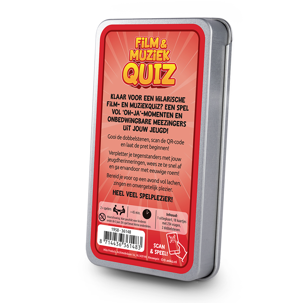 Gooi met de dobbelsteen, scan de QR-code en luister/bekijk het fragment en speel! Elk spel bevat 19 kaartjes en 2 dobbelstenen in een blikje met een luxe schuifbaar deksel.