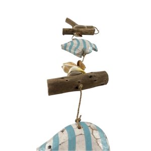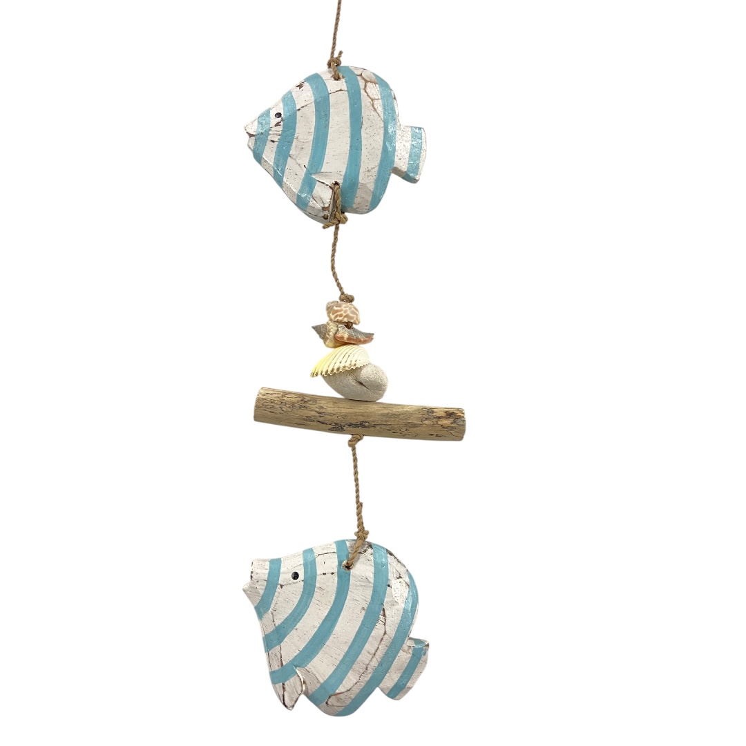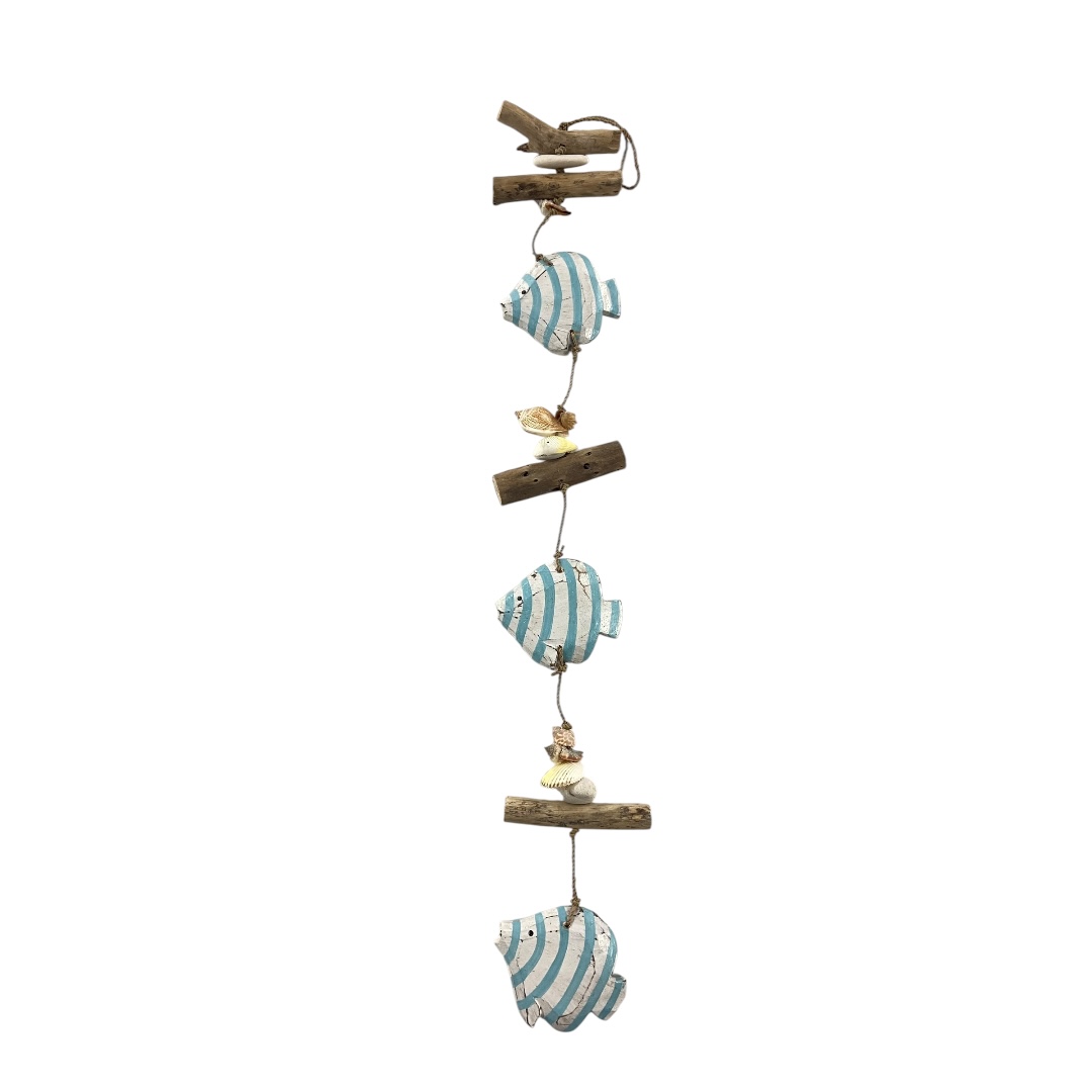 De vrolijk gestreepte visjes, gecombineerd met drijfhout en touw, zorgen voor een zomerse en natuurlijke uitstraling die perfect past in een strandhuis, badkamer of veranda.