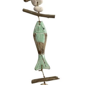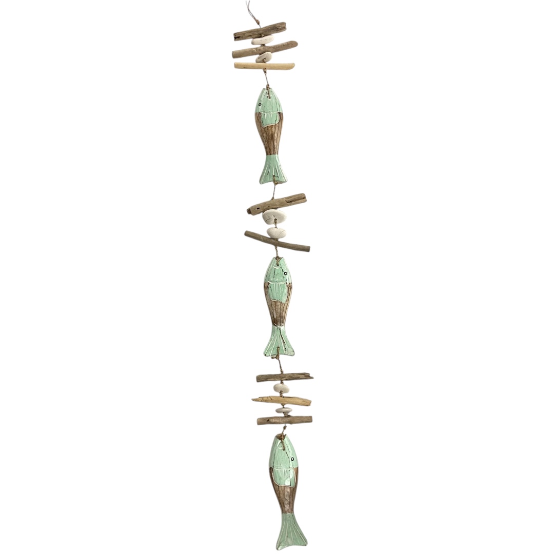 Guirlande van drijfhout met drie turquoise vissen, afgewisseld met naturel houten stukjes. De frisse turquoise kleur geeft een zomerse, coastal uitstraling en past perfect bij een beach of nautisch interieur. Leuk om op te hangen aan een wandhaak, deur, veranda of onder een overkapping.