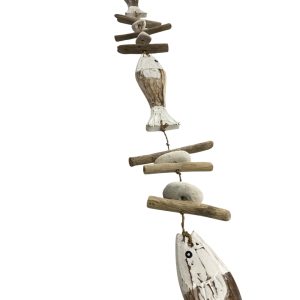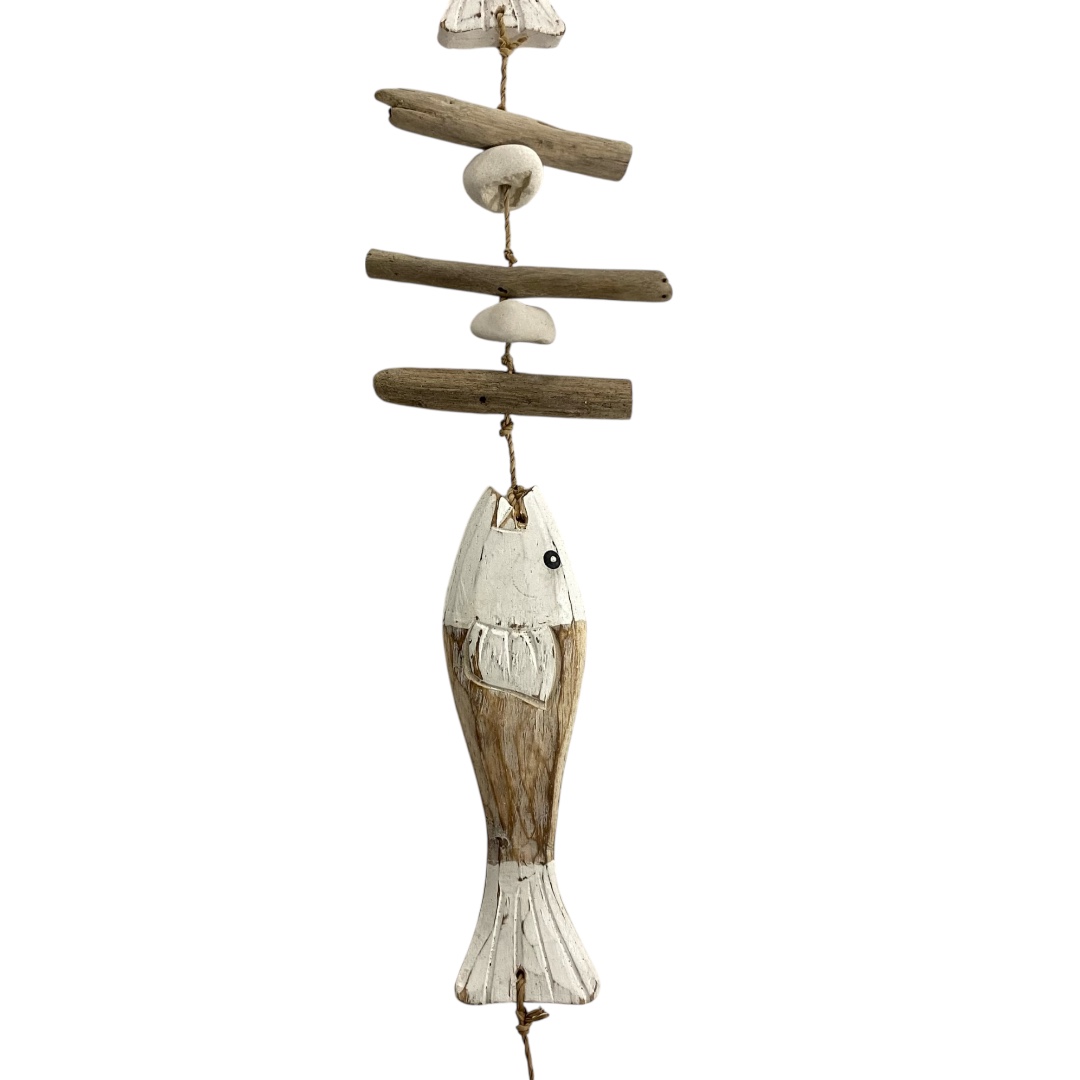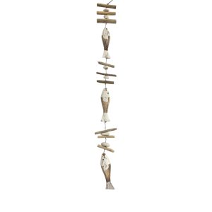 Guirlande van drijfhout met drie houten vissen in een witte kleur. Door de natuurlijke materialen en rustige tinten past deze hanger goed in een beach, coastal of naturel interieur. Leuk voor aan de muur, aan een deur of als sierlijke decoratie in huis of onder een overkapping.